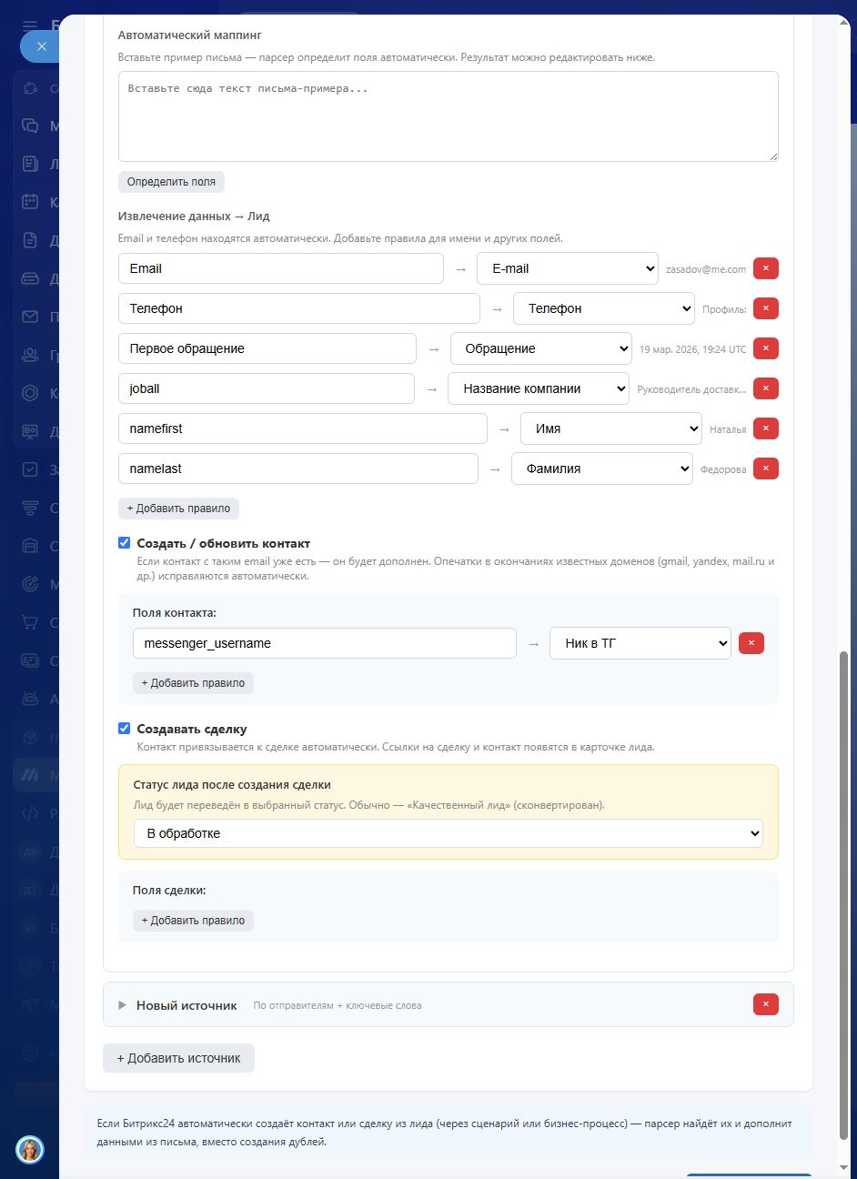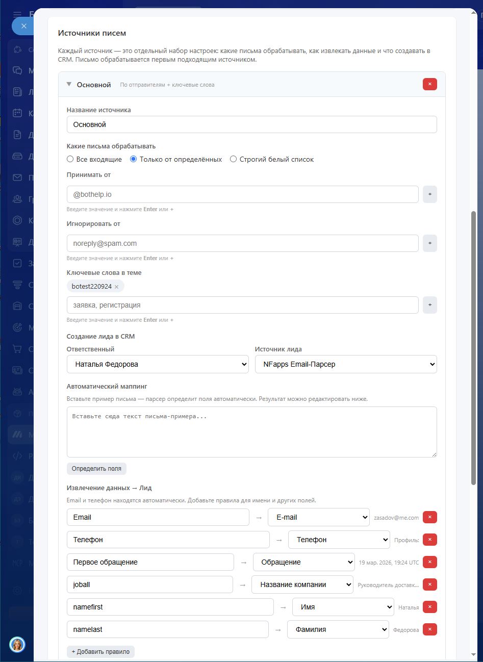 — Автоматический маппинг — парсер сам определяет поля по примеру письма, без ручной настройки.