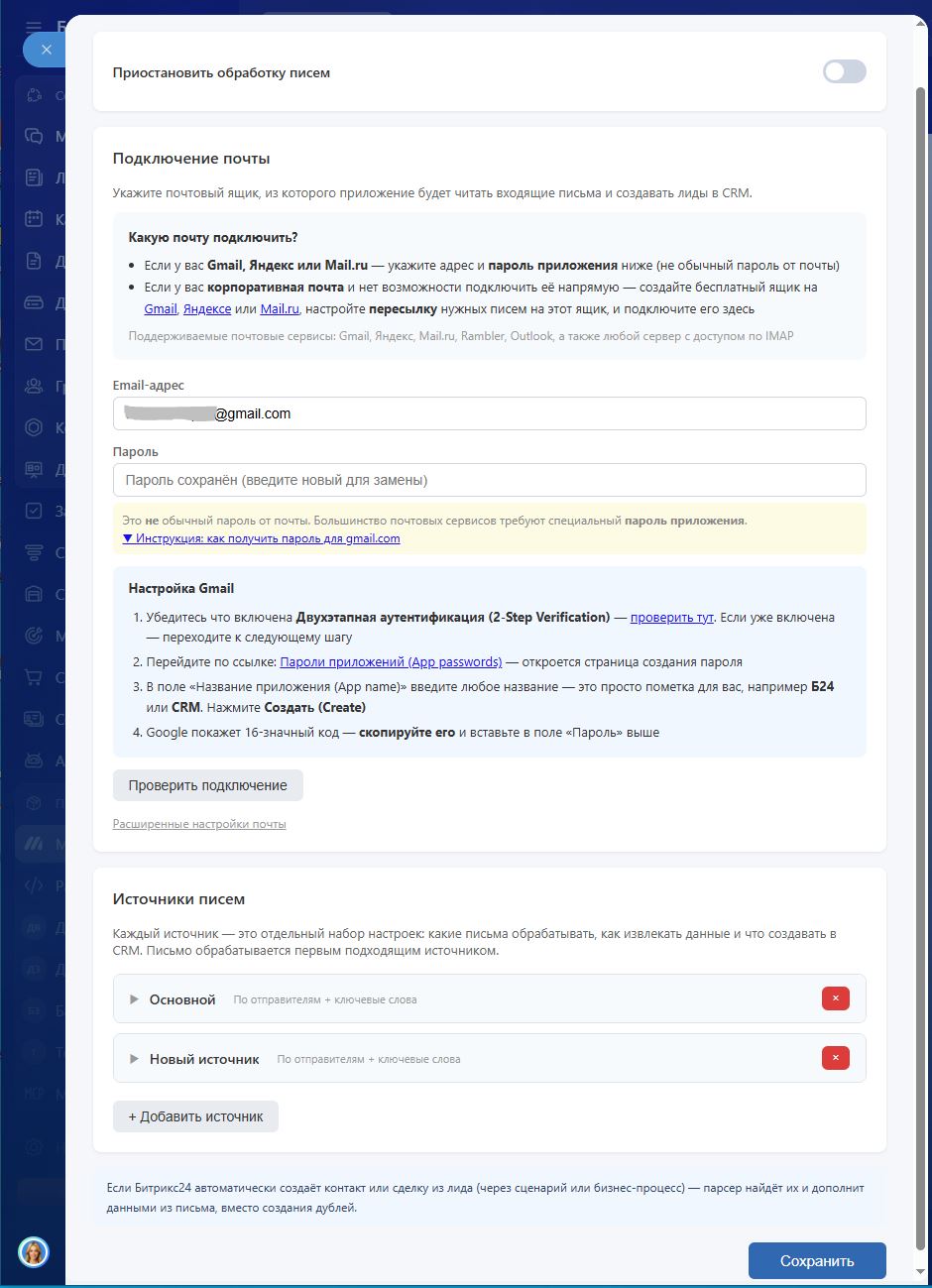 Большинство парсеров на маркетплейсе требуют подключить почту к CRM. Наше решение: