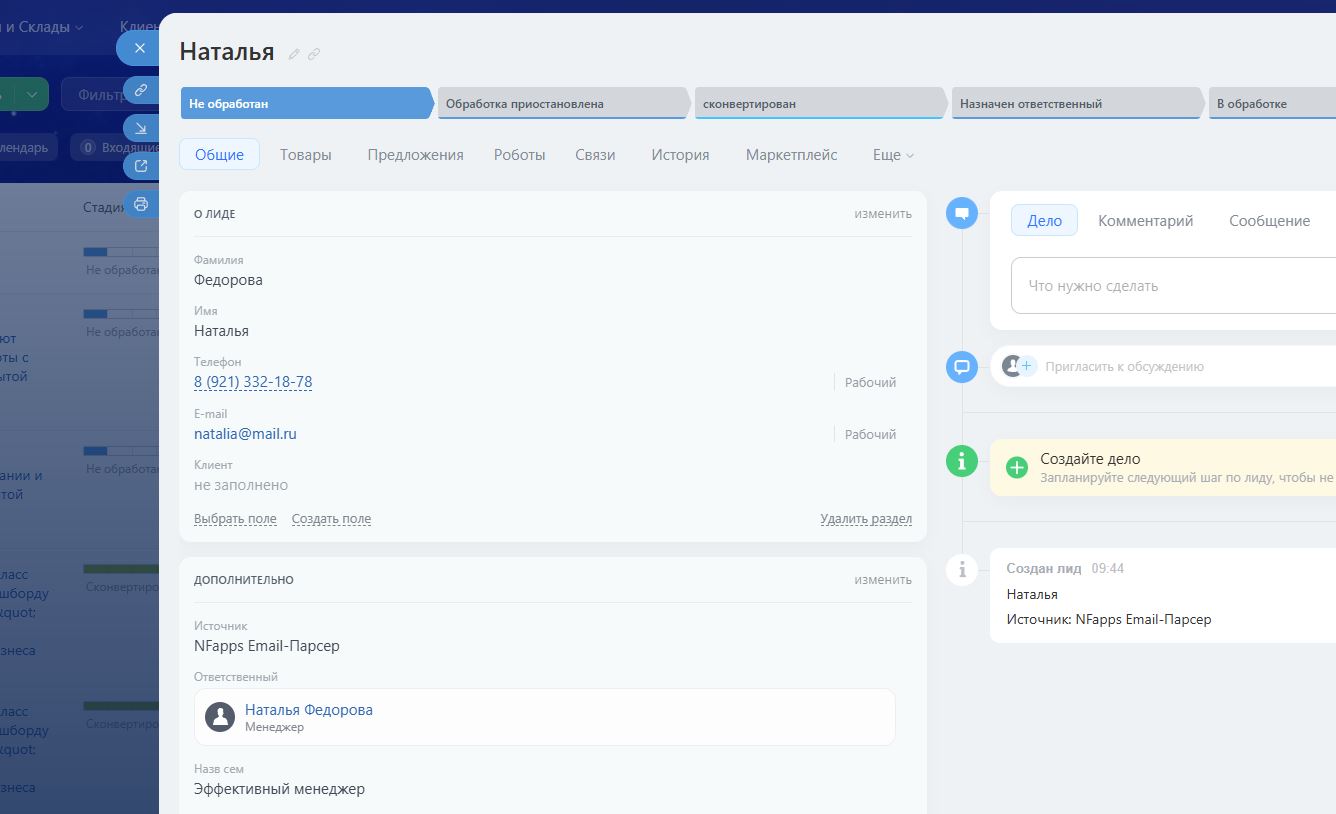 Битрикс24 с заполненными полями: имя, email, телефон, источник.