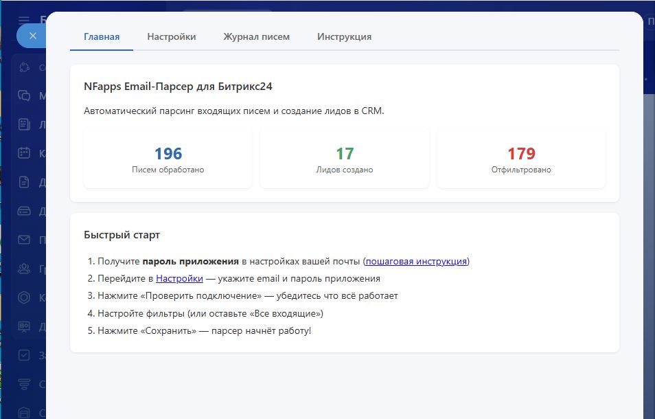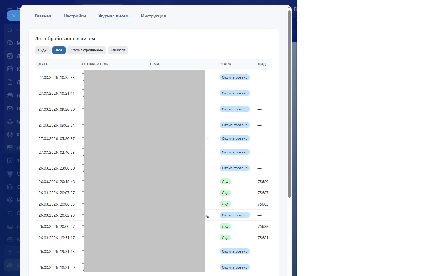 Умный Email-Парсер подключается к отдельному почтовому ящику, автоматически читает входящие письма и создаёт лиды в