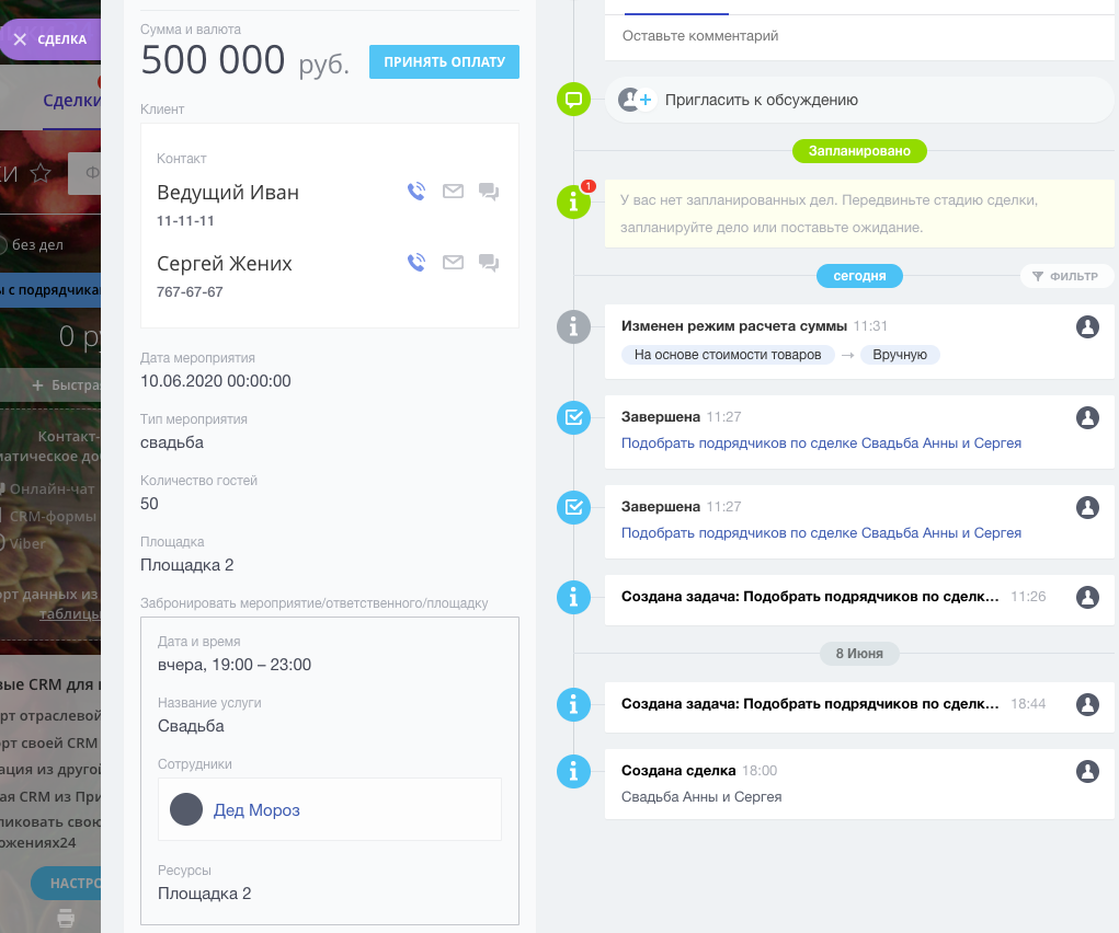 Это полная и подробная информация о заказе: участвующие в сделке контакты и компании (кроме клиента, можно ещё привязать внешних подрядчиков), сумма заказа, товары (если необходимо), дата мероприятия, тип мероприятия (корпоратив, свадьба, детский праздник, День Рождения, другое), площадка, коммерческое предложение (файл), смета (файл) и комментарий к сделке.