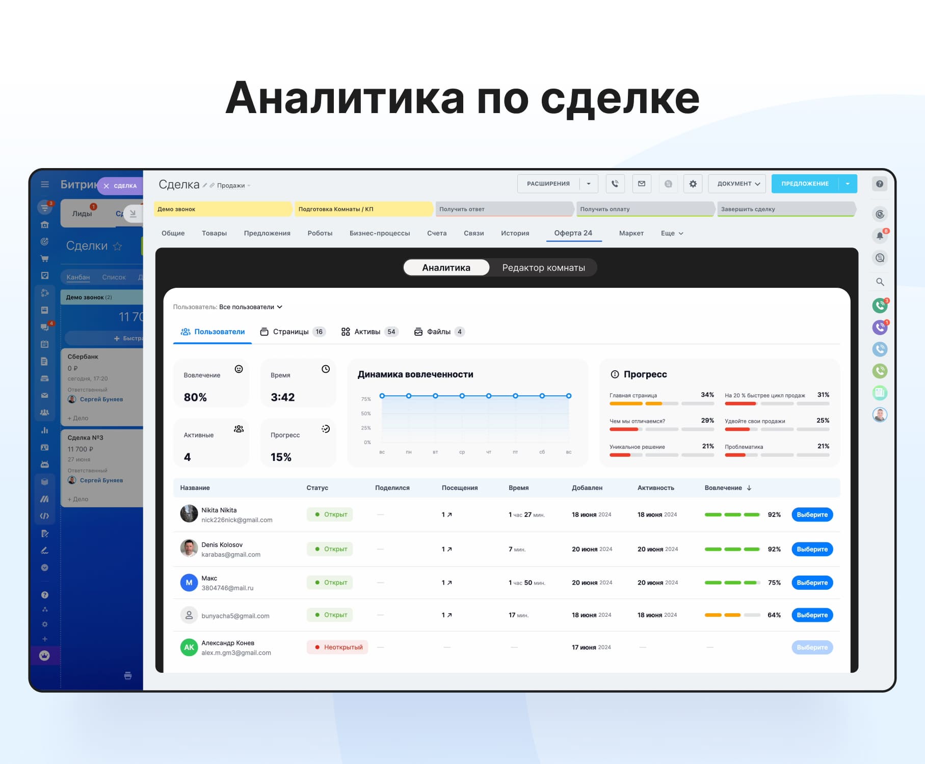 Второй этап: Менеджер отправляет ссылку на специальную комнату вместо множества вложенных файлов. Взамен он получает полный контроль над процессом продаж и детальную аналитику. Руководитель отдела видит эффективность работы команды и получает данные, которые помогают понять вовлеченность клиентов в режиме реального времени.