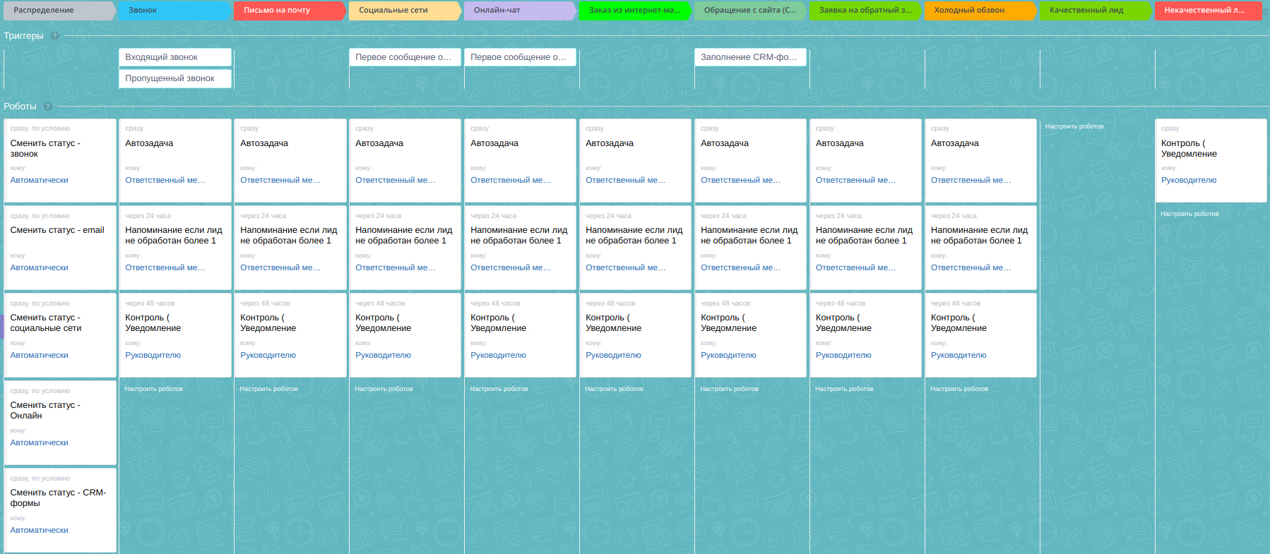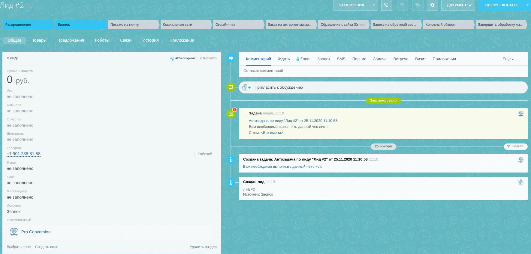 Доступна воронка лидов с автоматическим распределением и разбитыми этапами в Канбане.