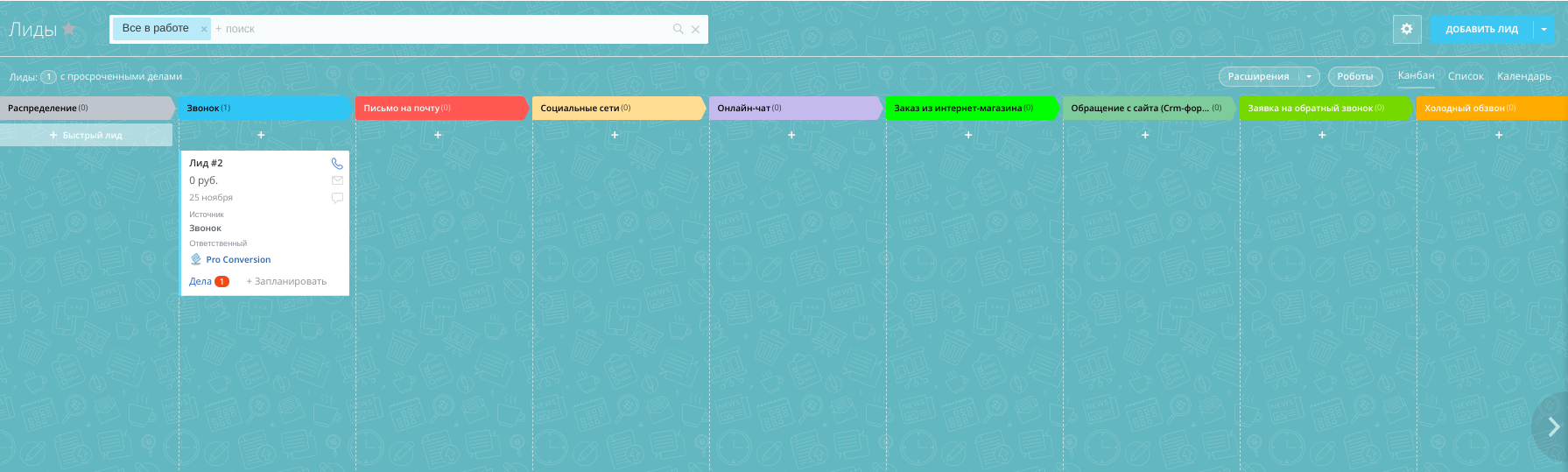 Доступна воронка лидов с ручным распределением и разбитыми этапами в Канбане.