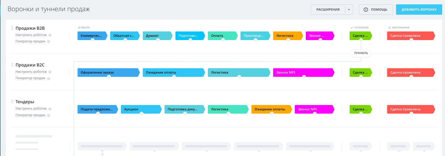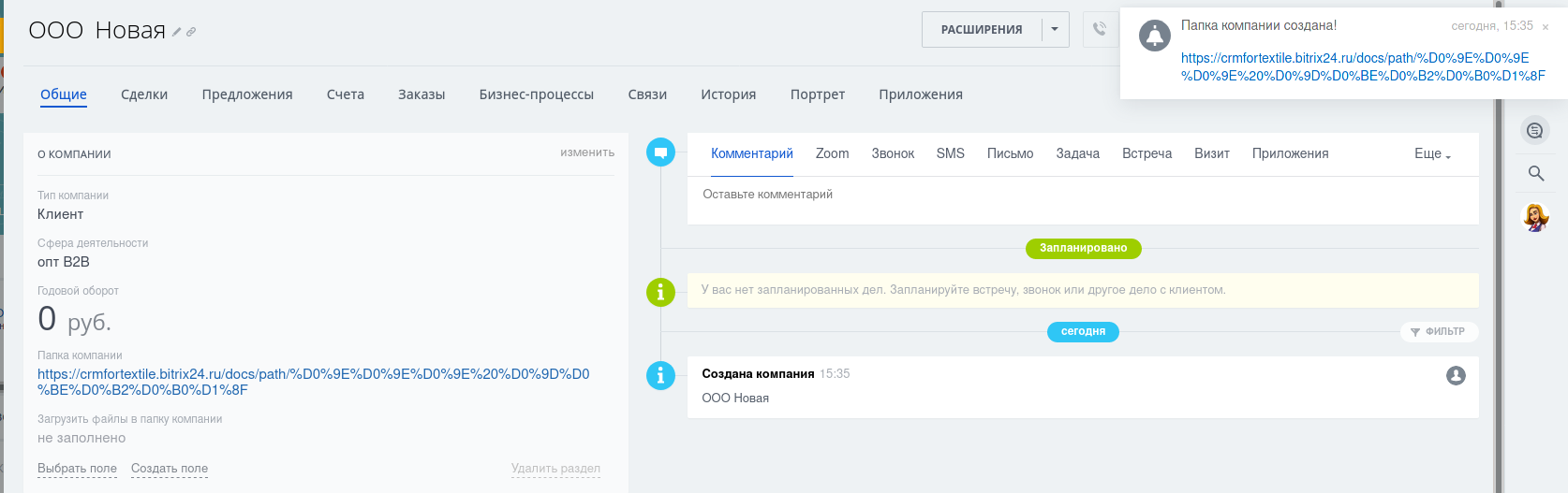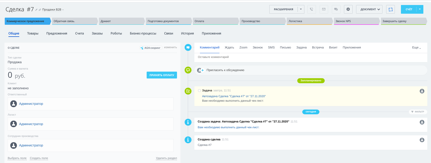 Доступна воронка "b2b" и стандартный пакет для формирования документов.