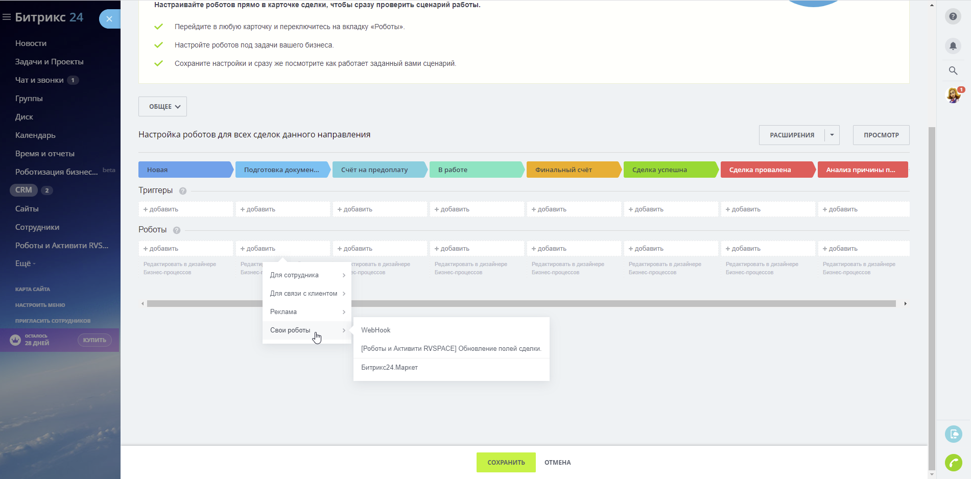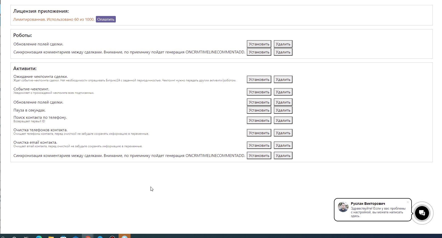 2. Роботы (Робот "Обновление полей сделок". Создан для массового обновления полей). Робот "Синхронизация комментариев между сделками".