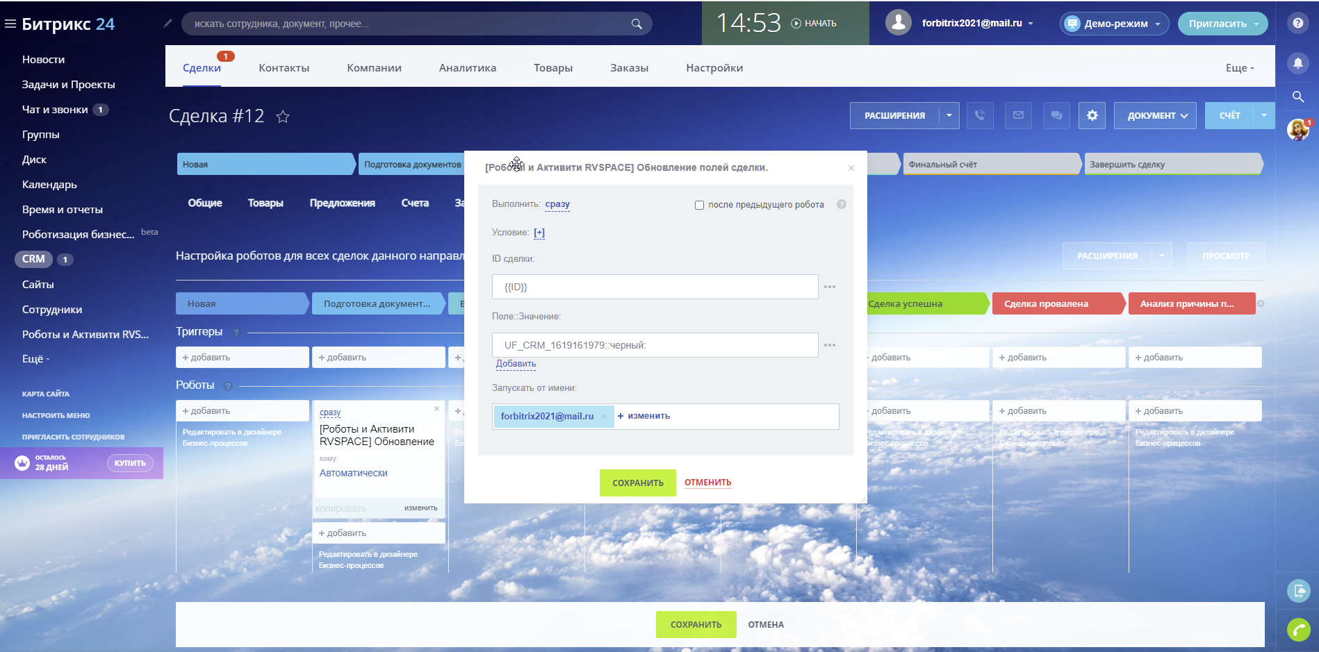 3) Обновление полей сделки (Создан, как и одноименный робот, для массового обновления полей сделок).