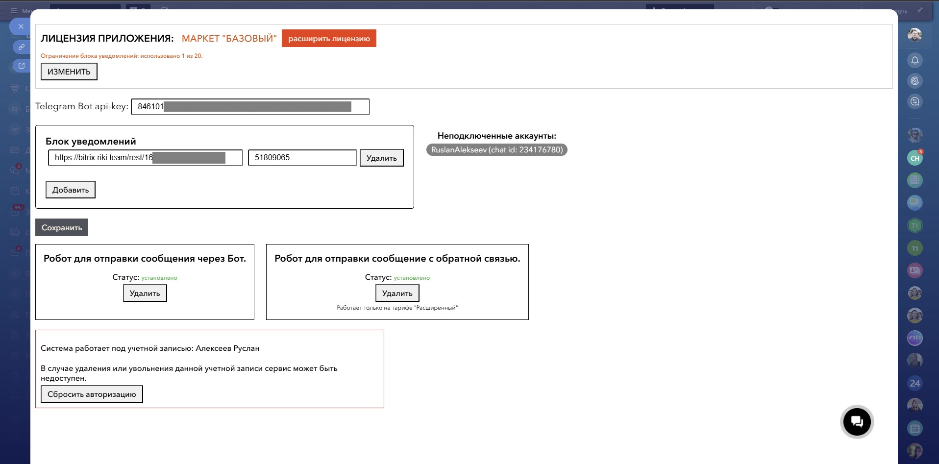 Тарифы:После установки активируется тариф "Маркет "Базовый" и 1 лимит на аккаунт для подключения ретрансляции уведомлений из "колокольчика" Битрикс24 в аккаунт телеграмм (можно транслировать в группу, если бот имеет на это права). В данном тарифе доступно активити для отправки уведомлений из бизнес-процессов (а так же роботов) Битрикс24. Количество отправок неограниченно.