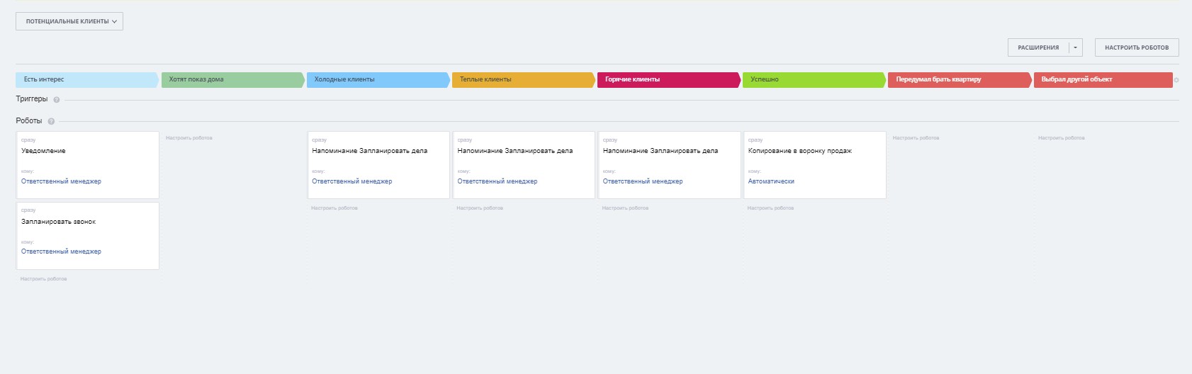 1) 3 воронки (“Потенциальные клиенты”, “Продажа”, “Наши дольщики”)