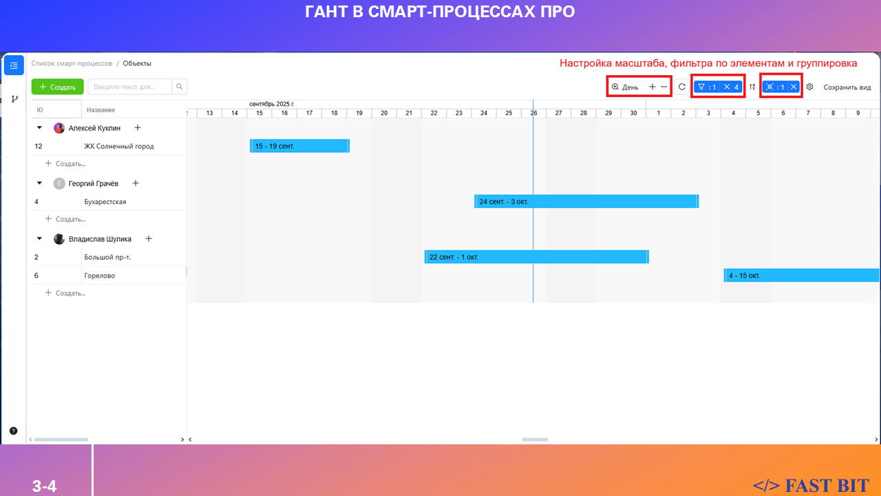 Теперь вы можете видеть все элементы смарт-процессов на диаграмме Ганта: удобно, структурировано и наглядно.