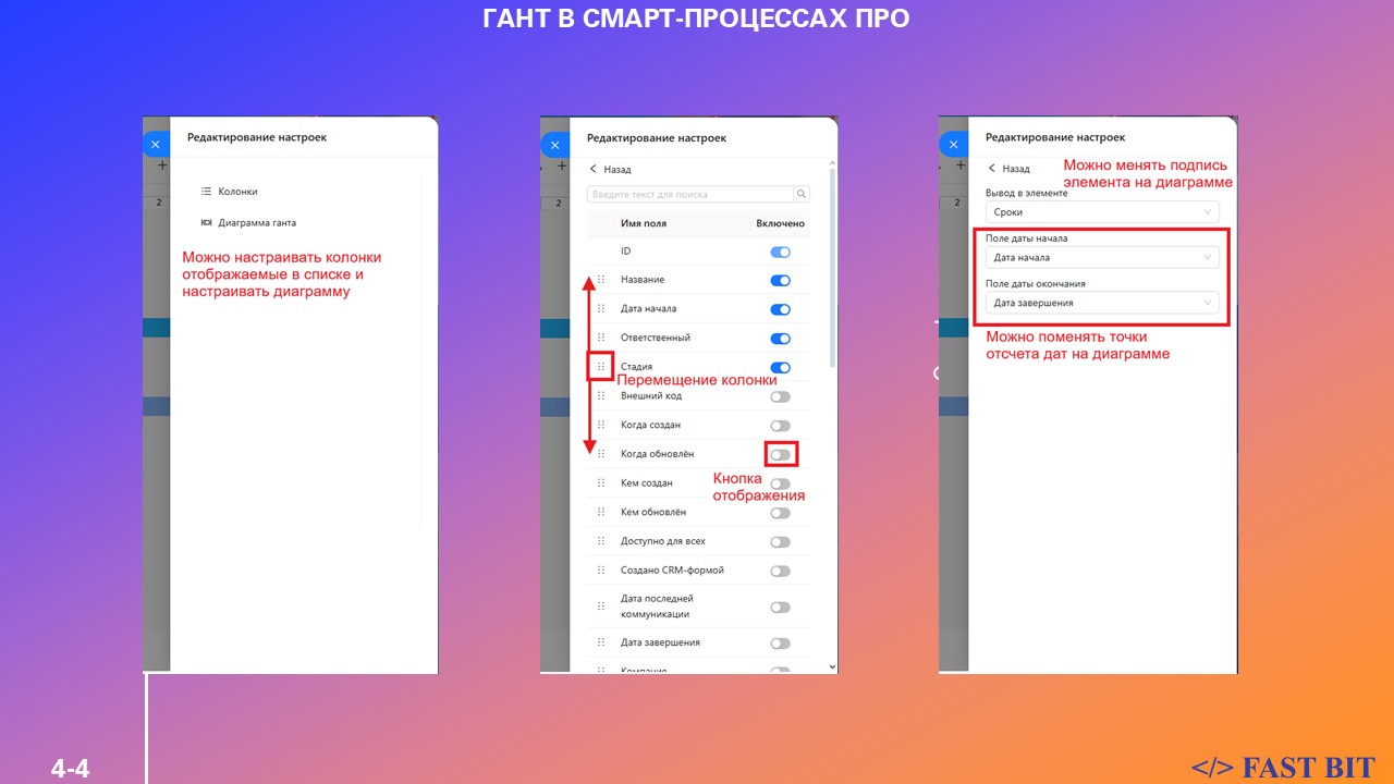 Убедитесь, что в настройках каждого смарт-процесса в разделе «Вид карточки» включены поля — дата начала и дата завершения.