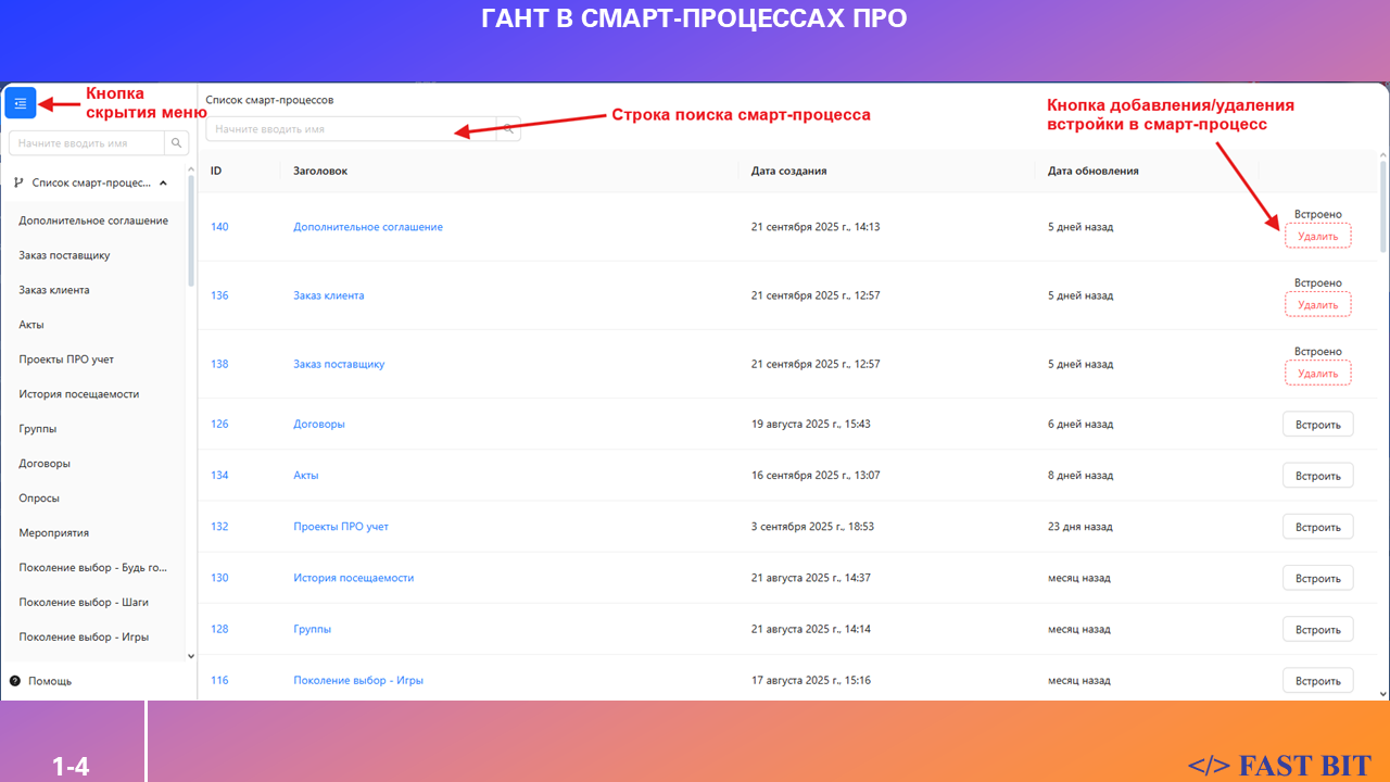 Перейдите в левом основном меню в пункт «Гант в Смарт-Процессах ПРО».