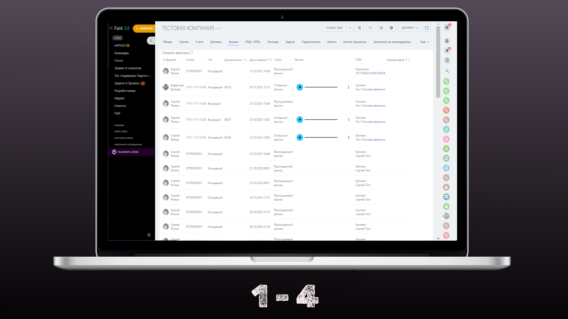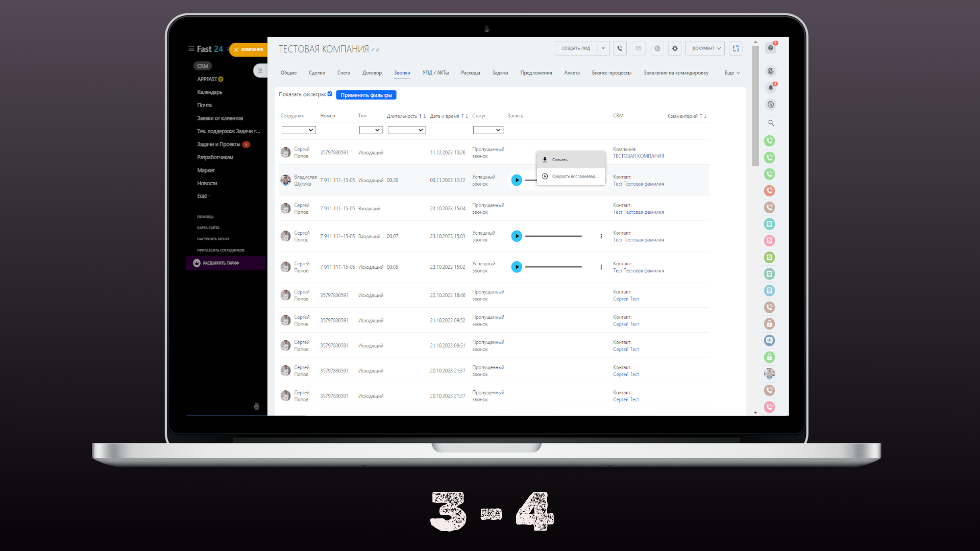 Проигрывание звонков: Непосредственно из карточки Компании или Контакта можно прослушать любой звонок, чтобы быстро вспомнить детали разговора или проанализировать общение.
