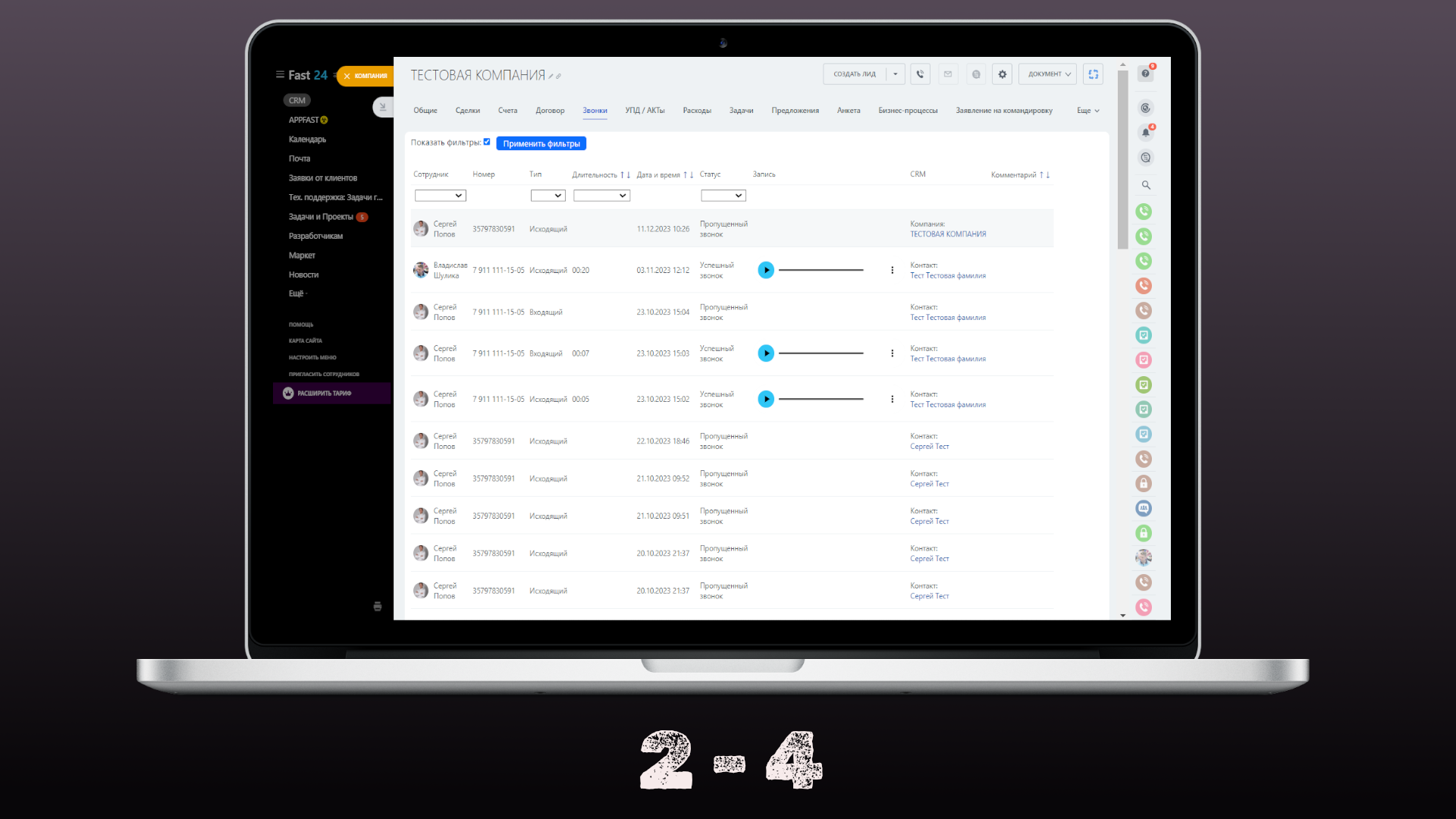 - Централизованный доступ к звонкам: Все звонки по конкретной Компании и связанным Контактам отображаются в одной вкладке, что обеспечивает быстрый доступ и удобную навигацию.