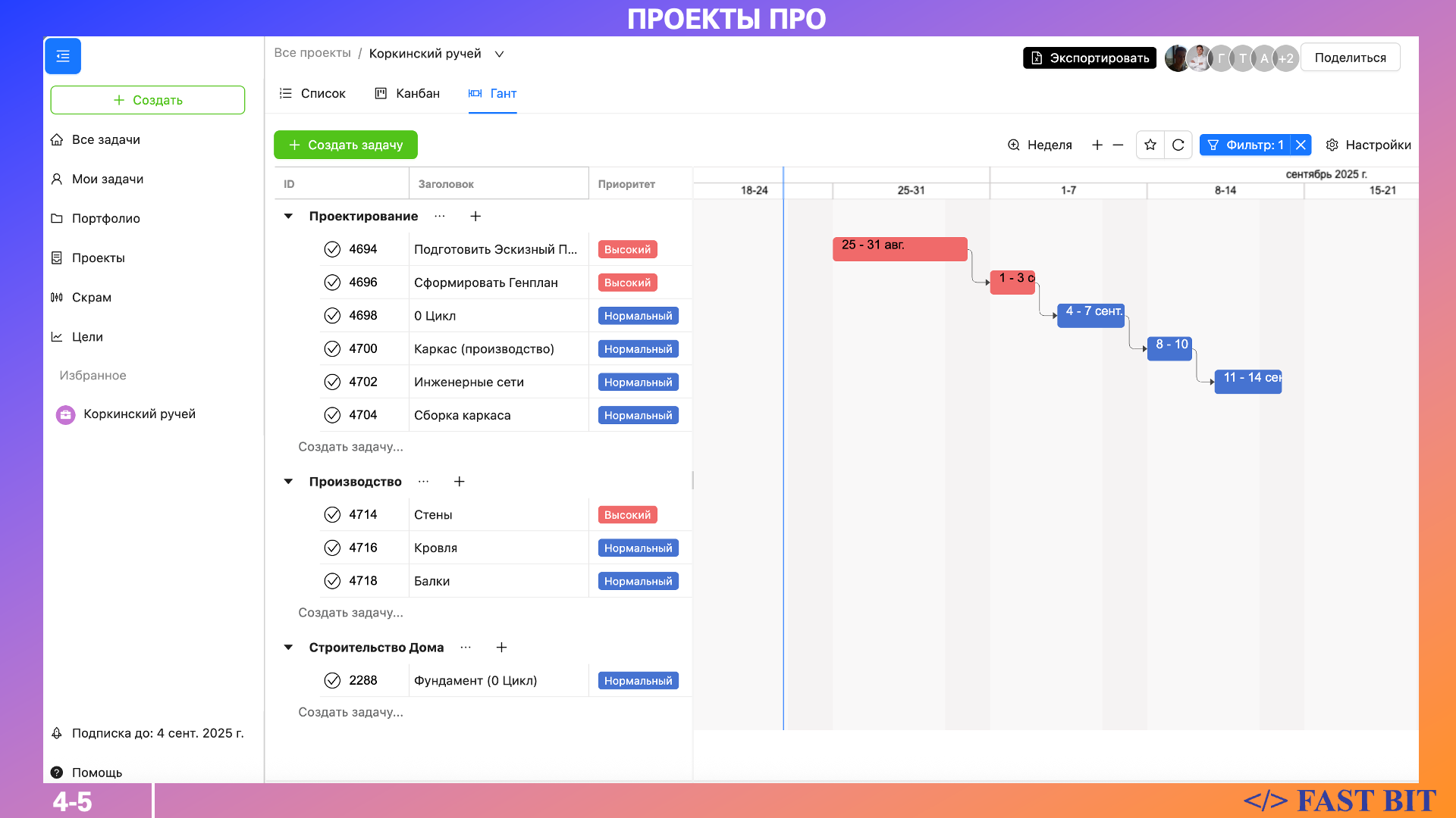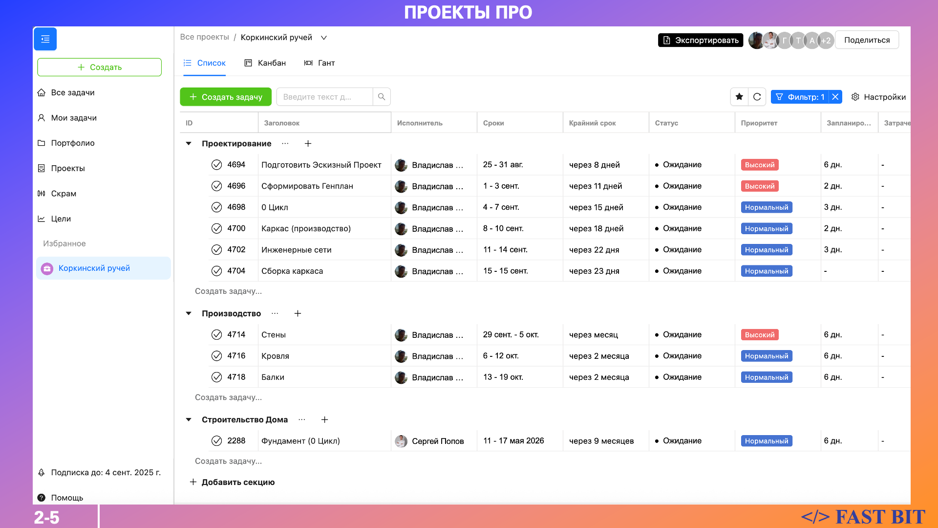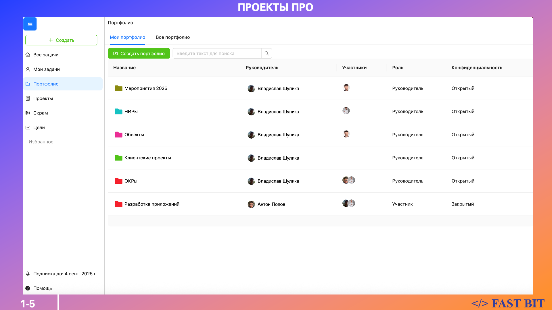 - Входит в подписку Fast Bit ПРО, которая открывает доступ не только к Проектам ПРО, но и к другим решениям серии ПРО: Скрам ПРО, Смарт-Процессы ПРО и другие.