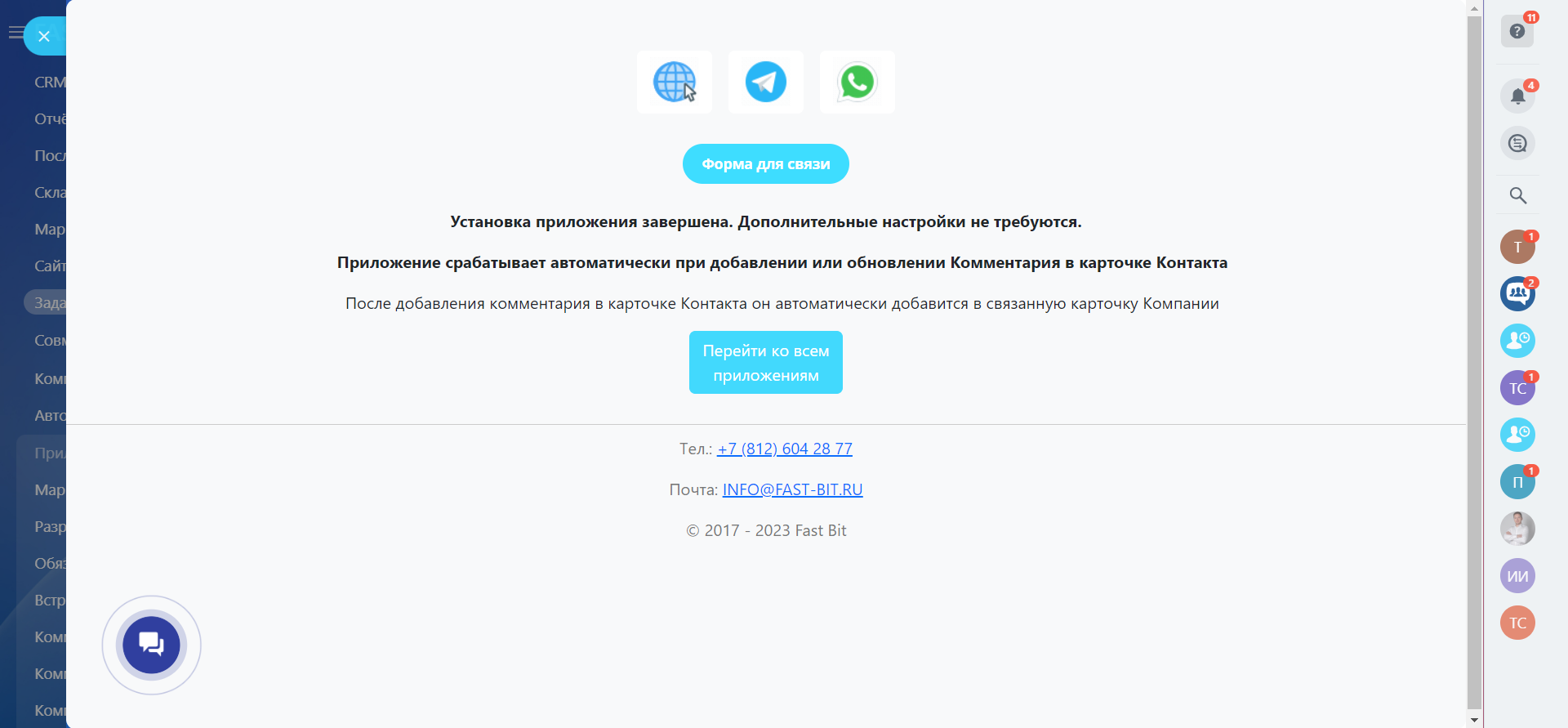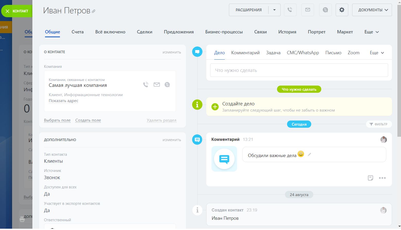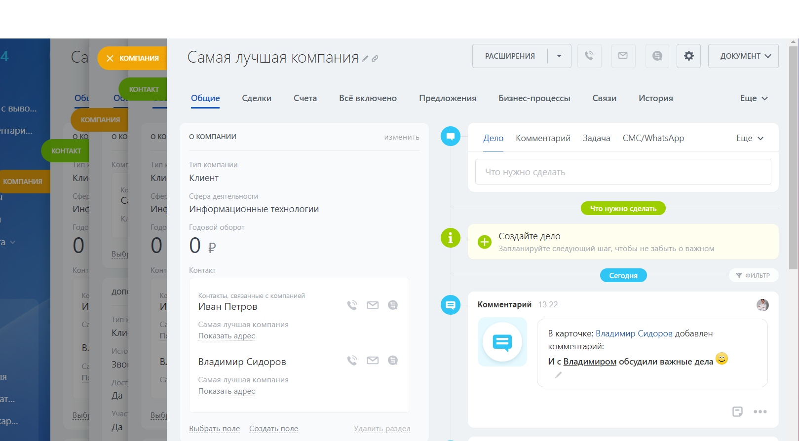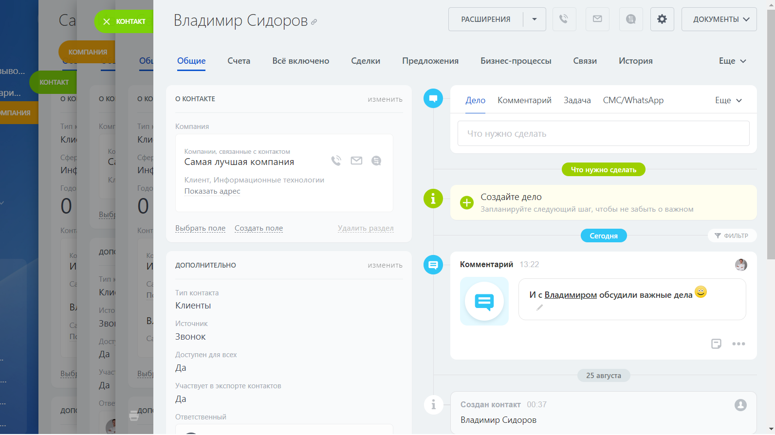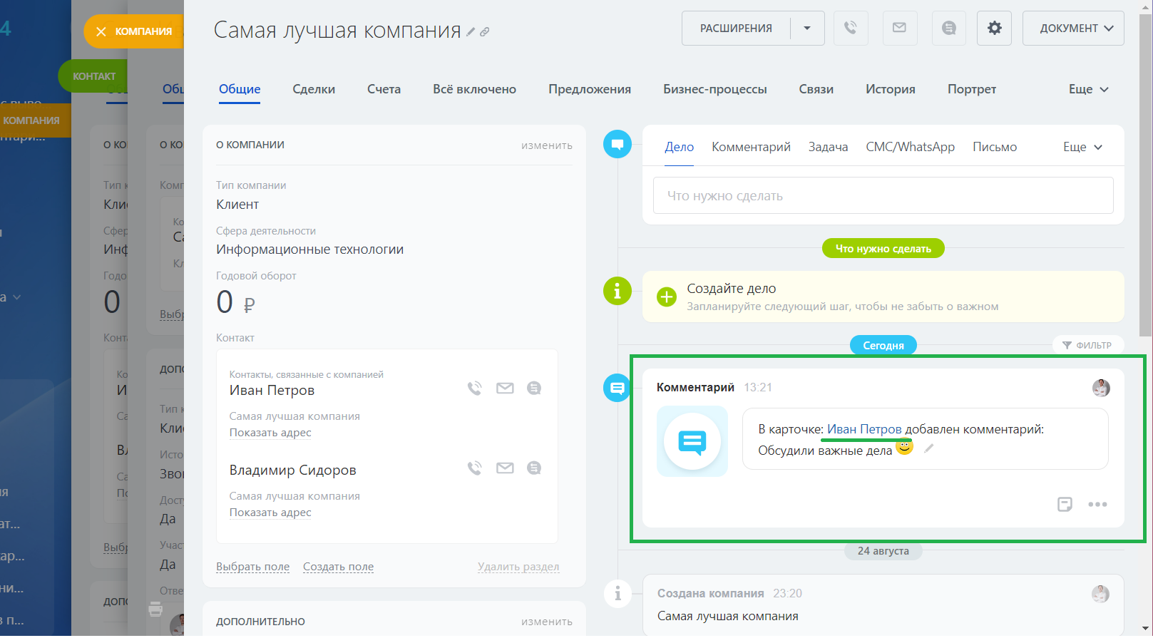 При добавлении или обновлении комментария в карточке Контакта - он автоматически продублируется в связанную карточку Компании, с указанием ссылки на источник Контакта.