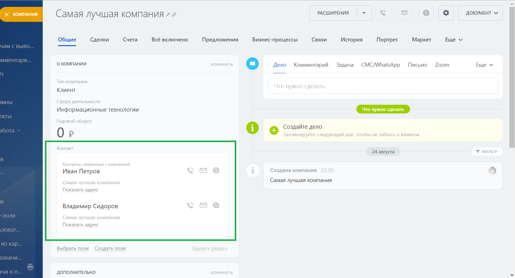 В крупных Компаниях, как правило, разные Контакты отвечают за разные процессы и общение происходит с разными людьми из одной Компании.