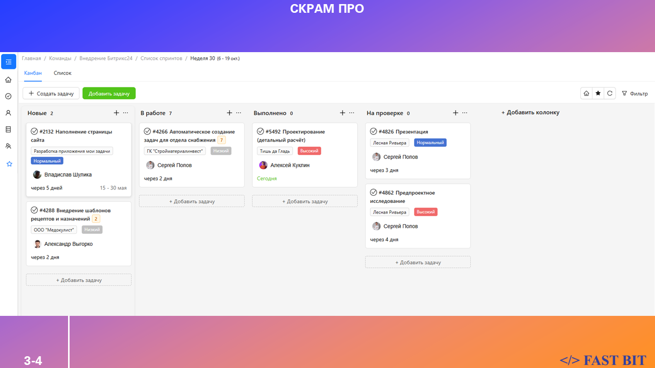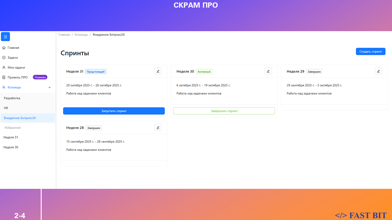 - Входит в подписку Fast Bit ПРО, которая открывает доступ не только к Скрам ПРО, но и к другим решениям серии ПРО: Проекты ПРО, Смарт-Процессы ПРО и другие.