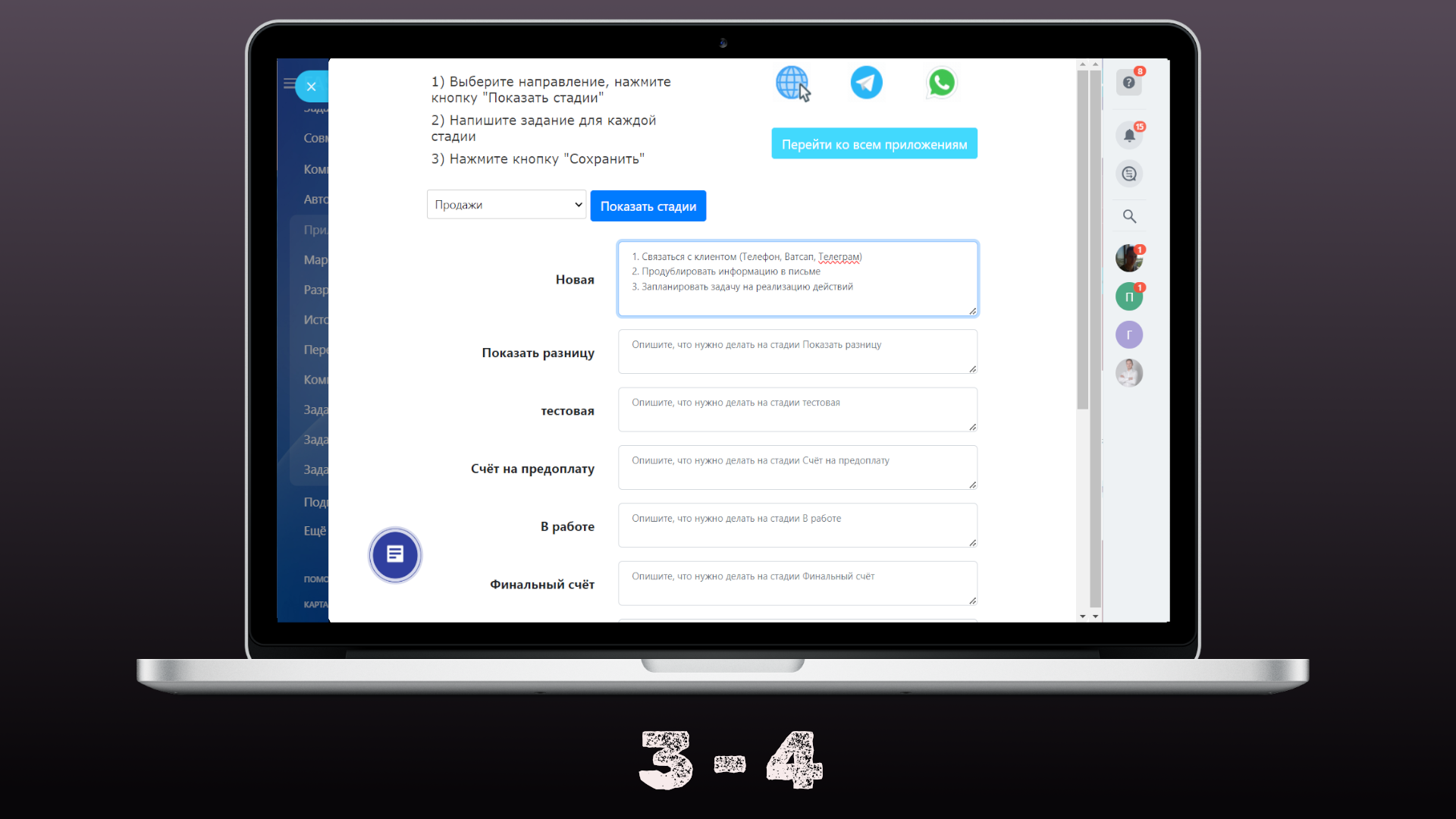 Помогает описать задания по стадиям и разместить их на каждой стадии Сделки