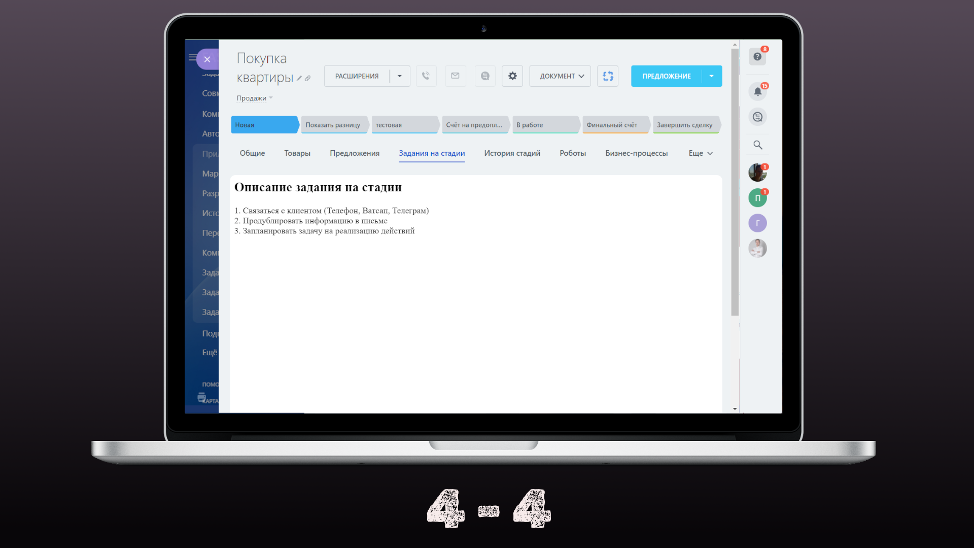 Удобный доступ: Задания на стадиях отображаются в удобной встроенной панели на странице сделки, что обеспечивает быстрый и легкий доступ.