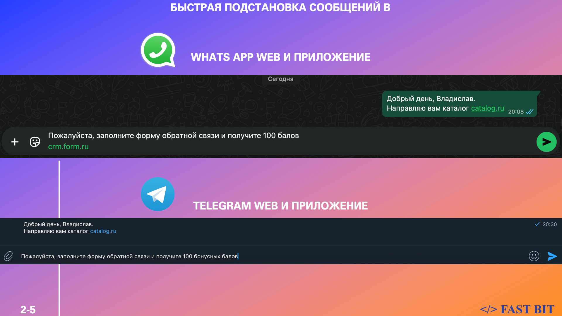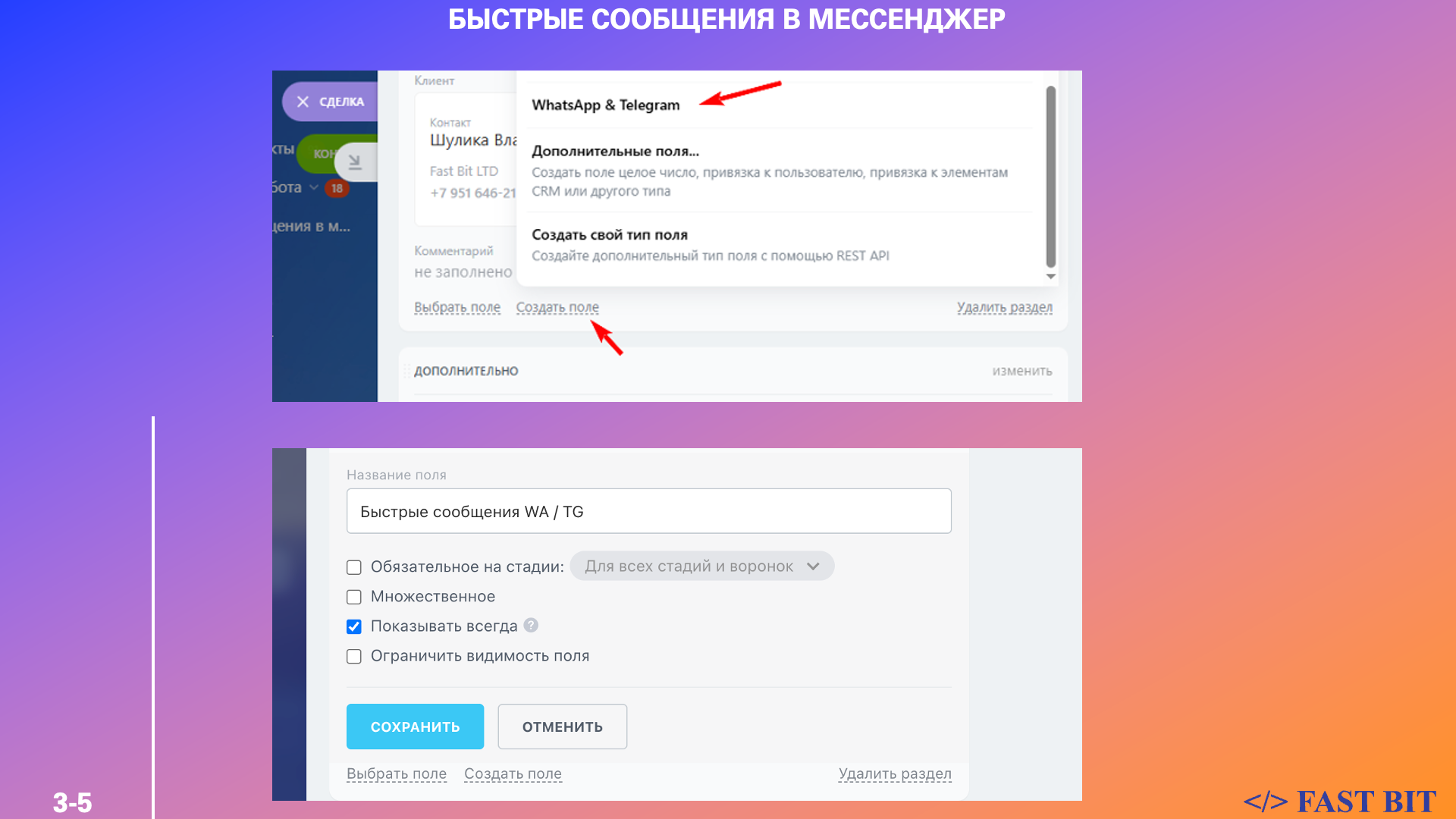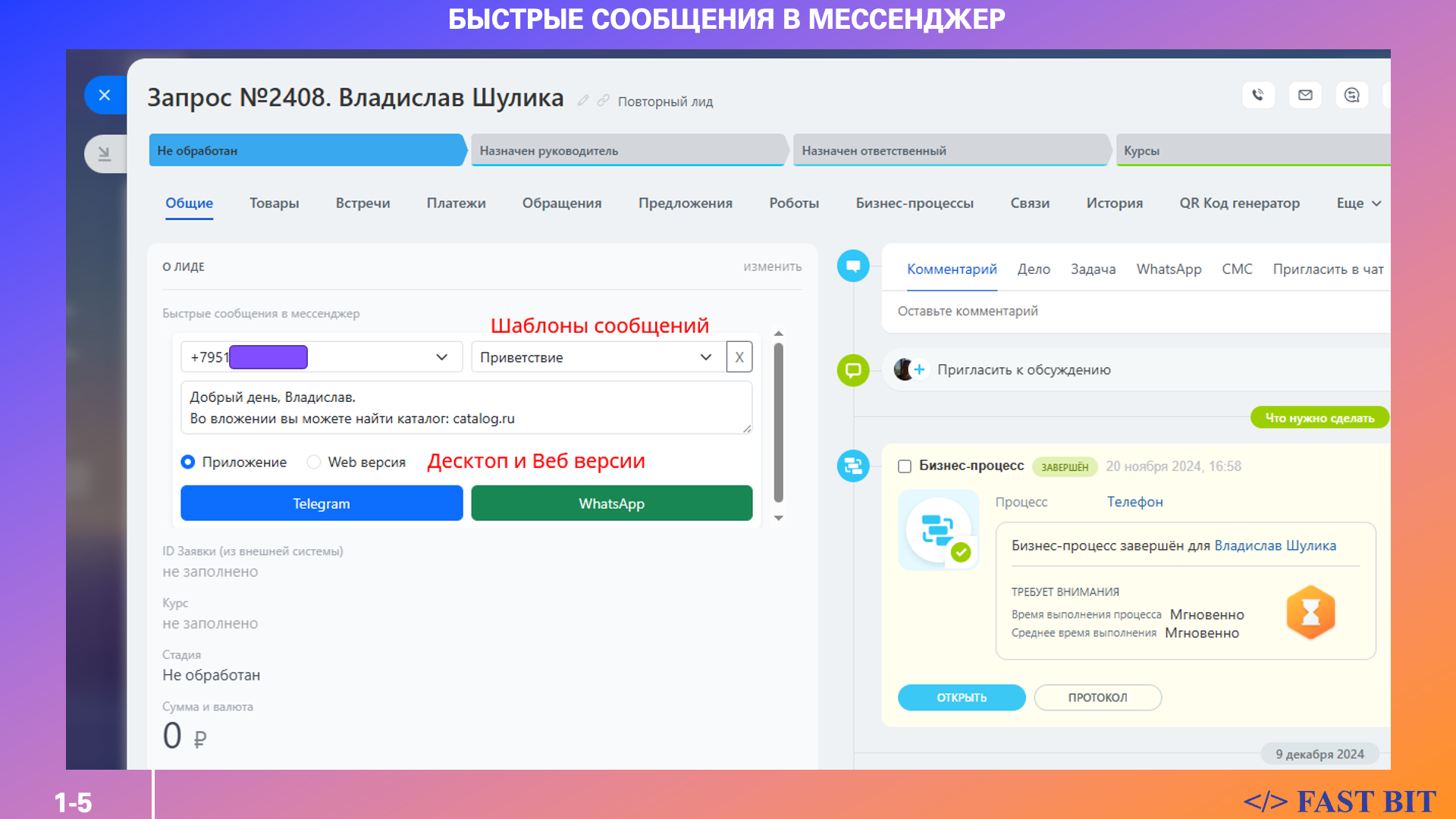 WhatsApp и Telegram прямо из CRM! Отправляйте сообщения клиентам из карточек CRM за секунды — удобно, быстро и без лишних интеграций и затрат.