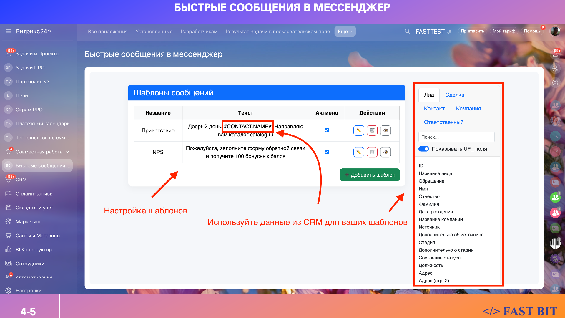Быстрое приветствие новым лидам: «Добрый день, {{Имя}}, вы оставили заявку на нашем сайте…»
