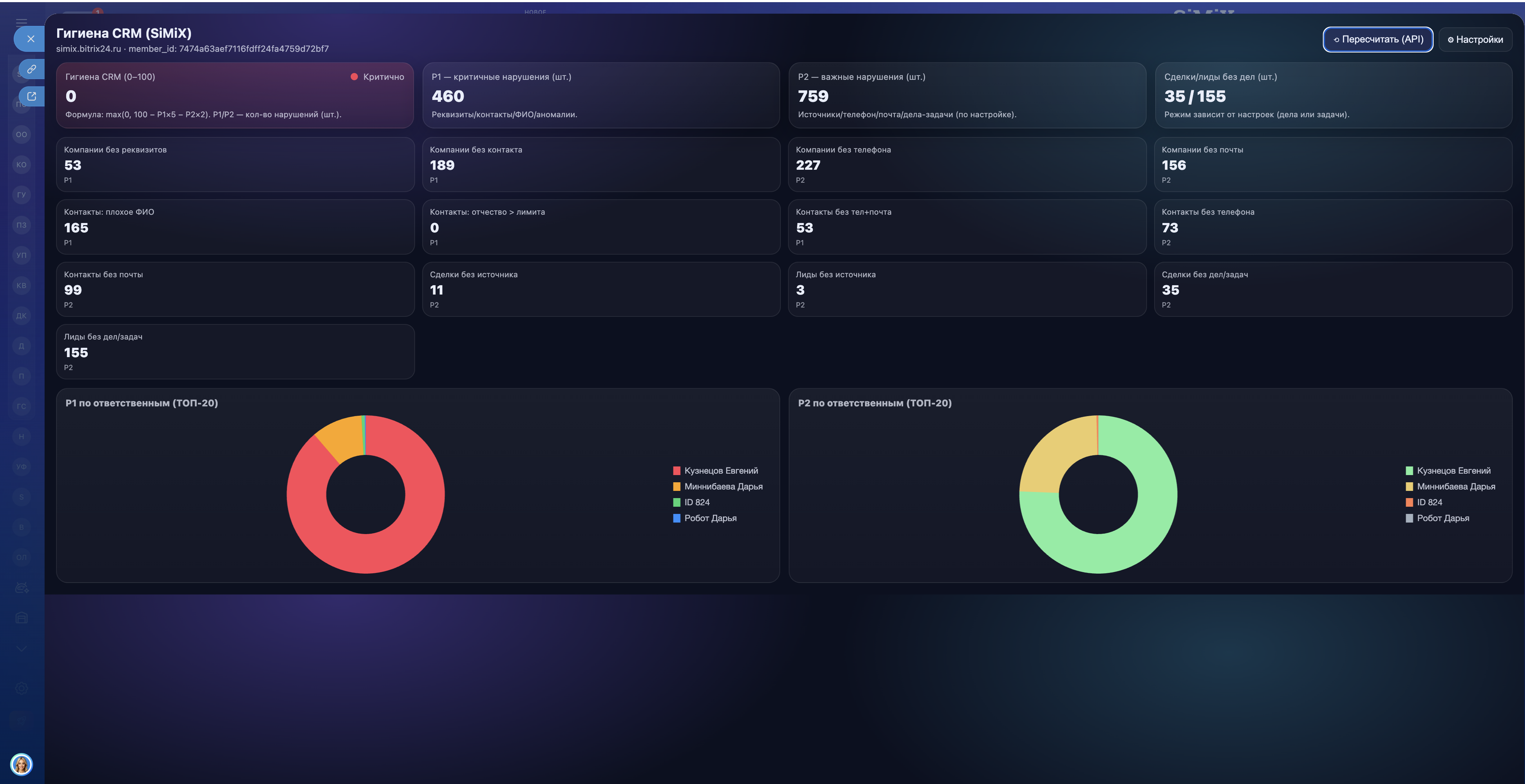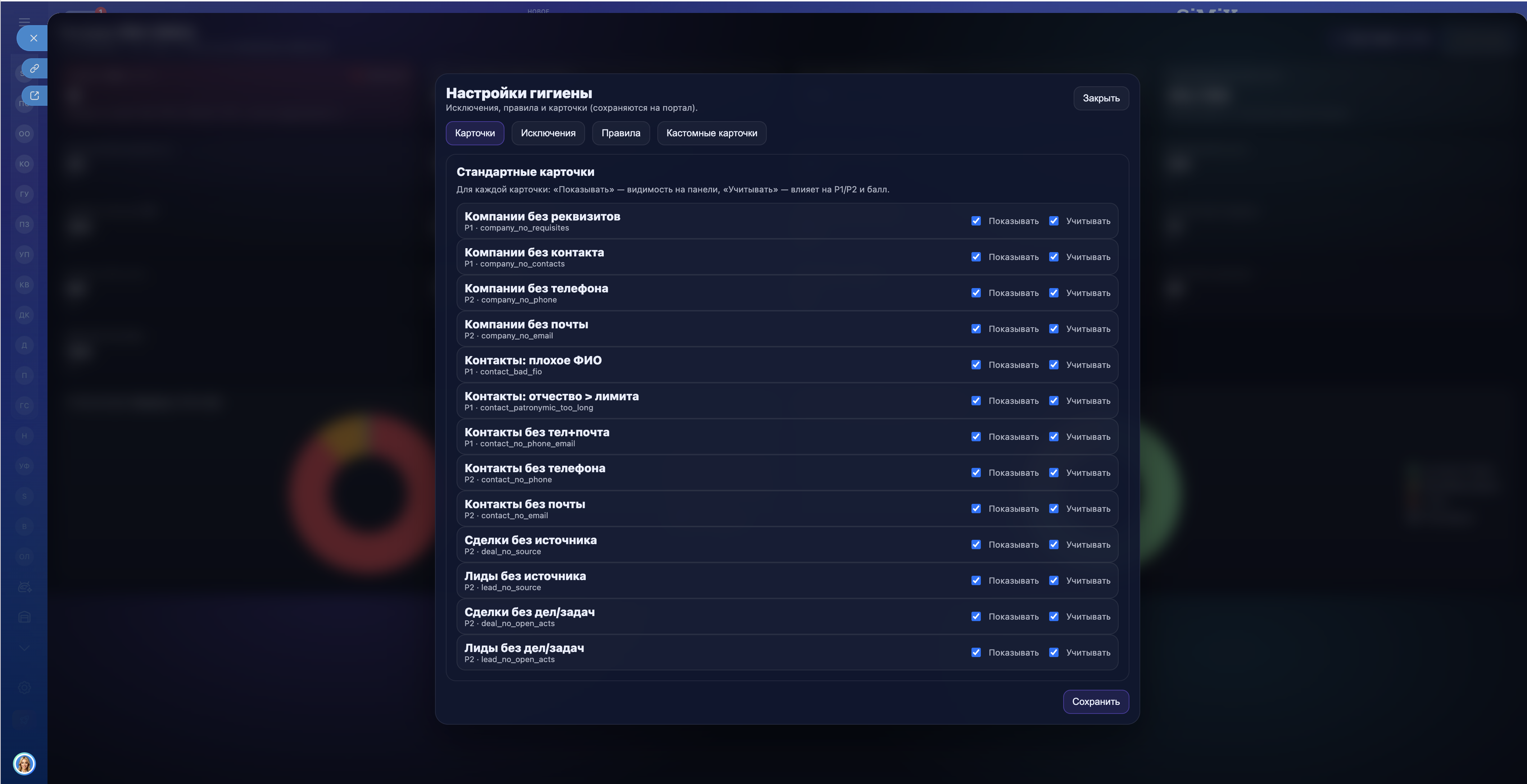 ГИГИЕНА CRM — это инструмент контроля качества данных, который помогает находить и системно устранять проблемы в CRM: незаполненные поля, нарушения регламентов, ошибки в контактах, компаниях, лидах и сделках.
