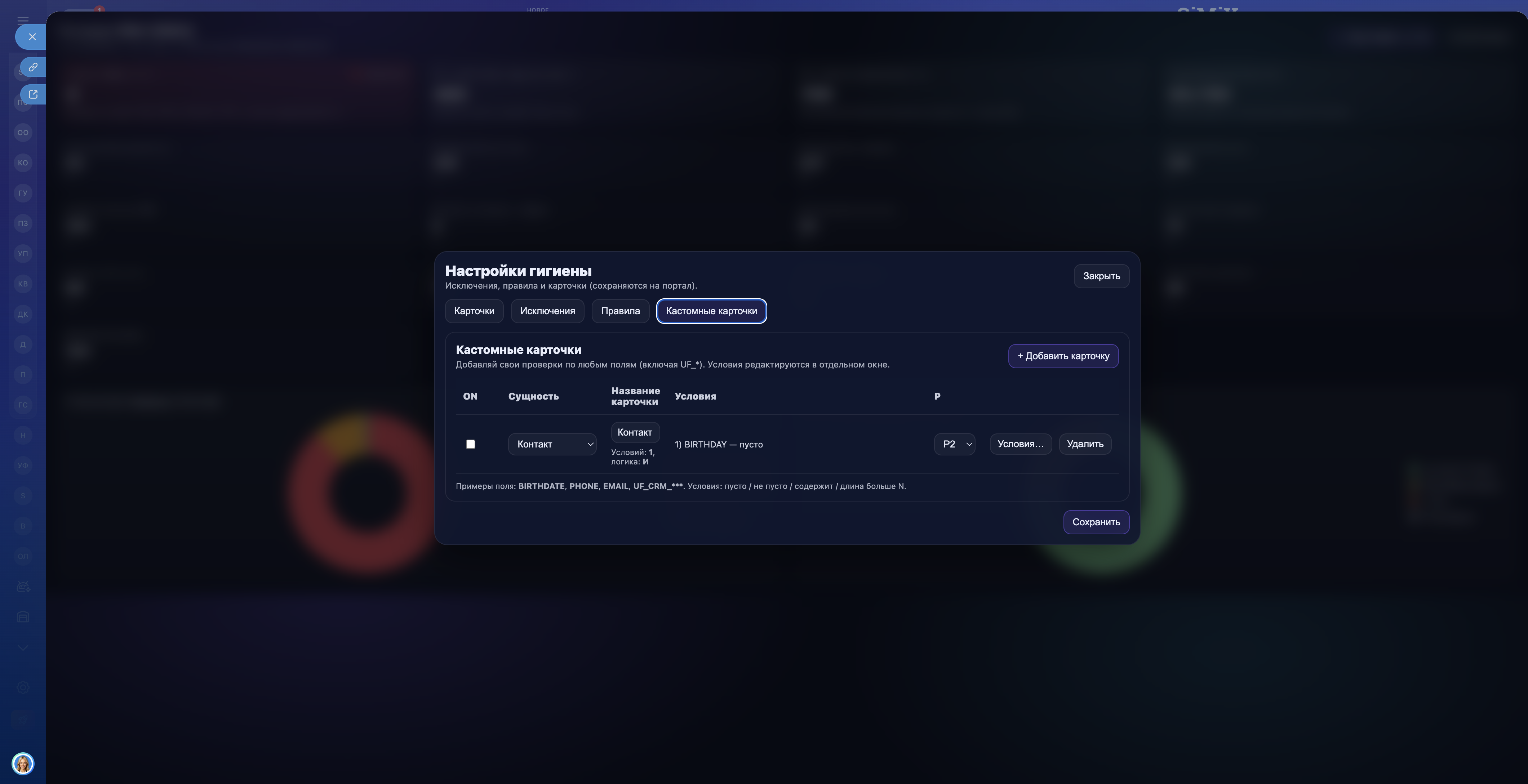Поддерживаются кастомные карточки проверок: вы сами задаёте условия по любым стандартным и пользовательским полям (включая UF-поля), комбинируя их логикой И / ИЛИ. Все настройки сохраняются на портале и учитываются при пересчёте показателей.