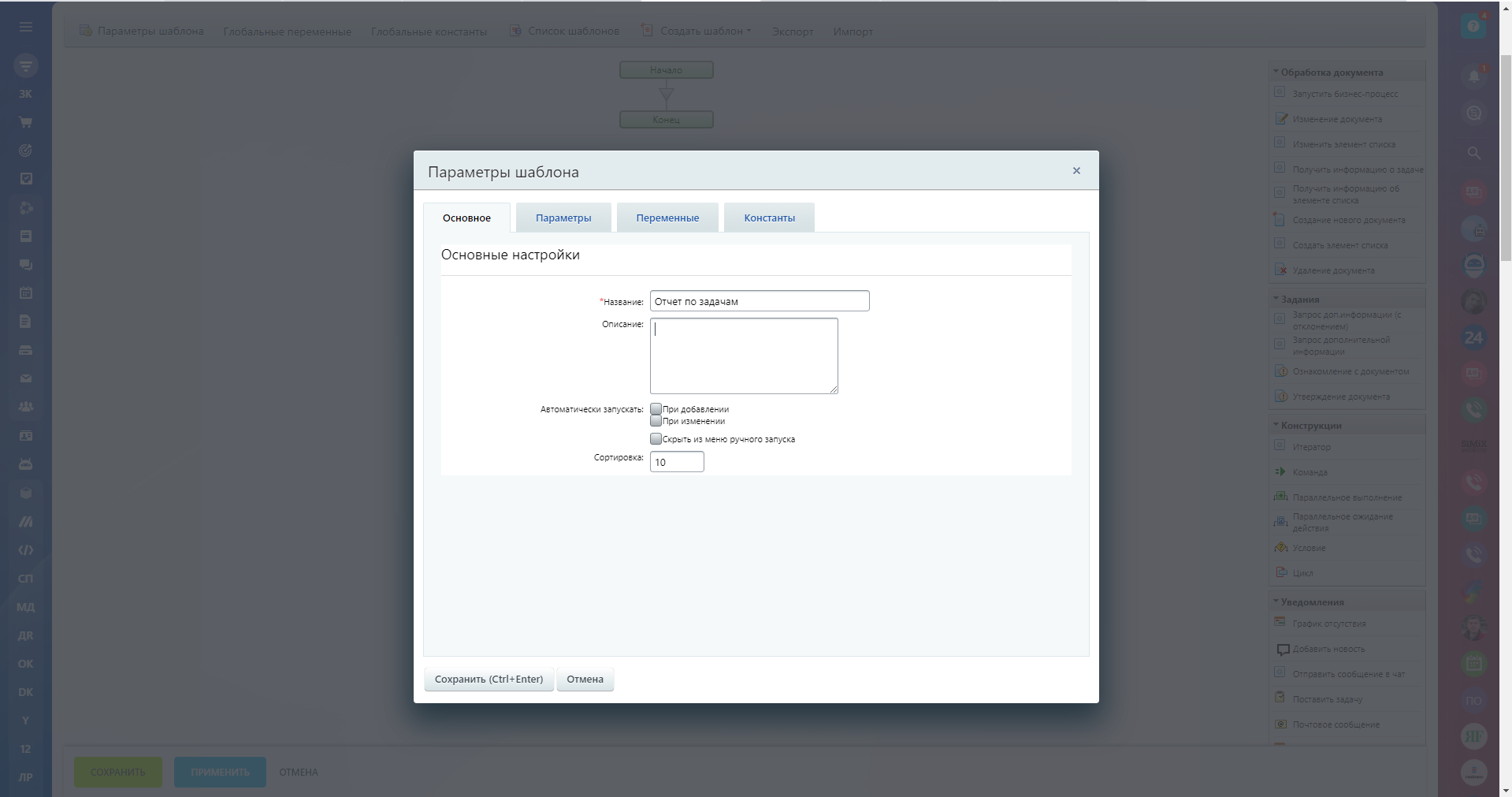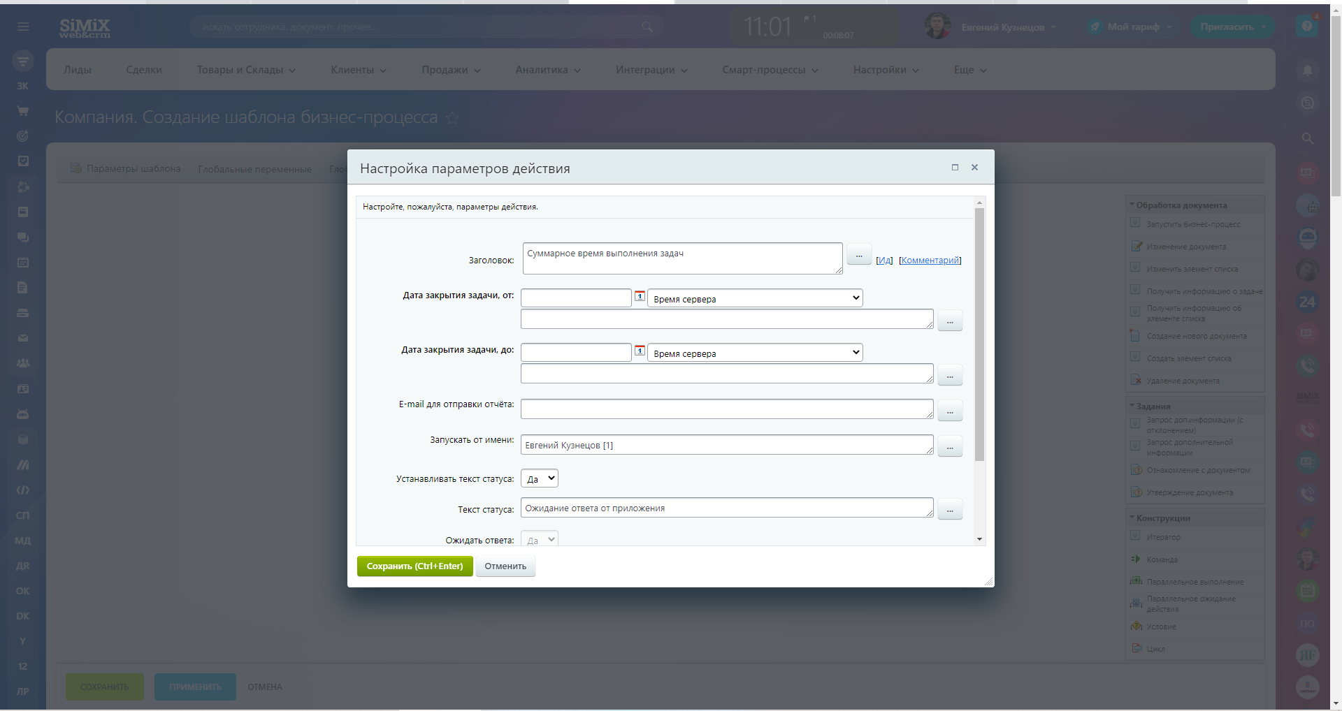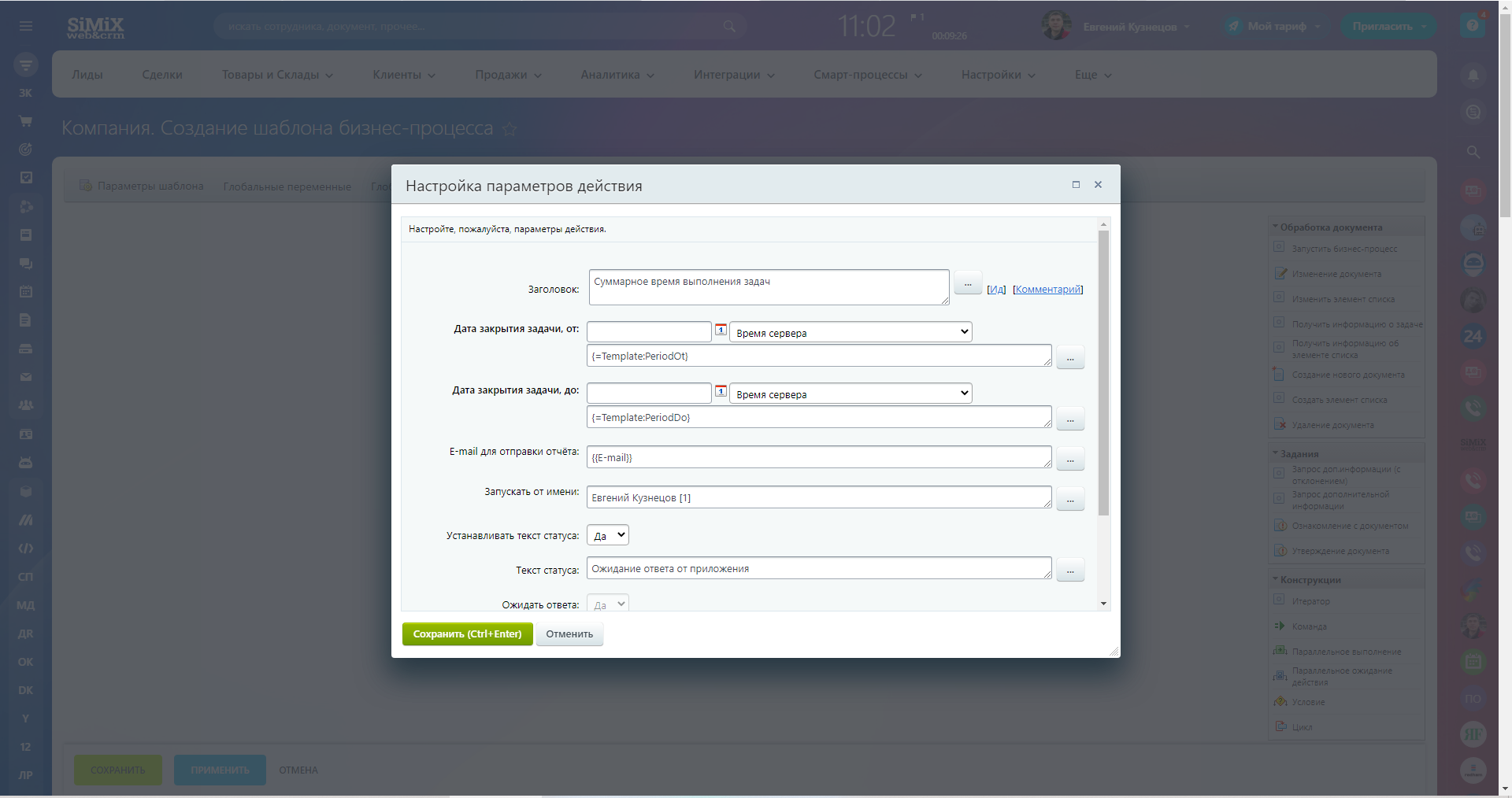 9. Сценарий собран, давайте проверим его работу, запустим созданный бизнес-процесс через кнопку запуска бизнес-процессов. Процесс запросит указать даты за какой период нужен отчет по задачам.