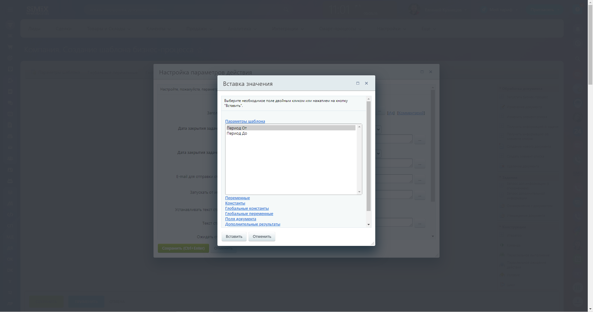 5. Укажите периоды дат в соответствующих полях, используя значения параметров запуска бизнес-процесса из пункта 3.