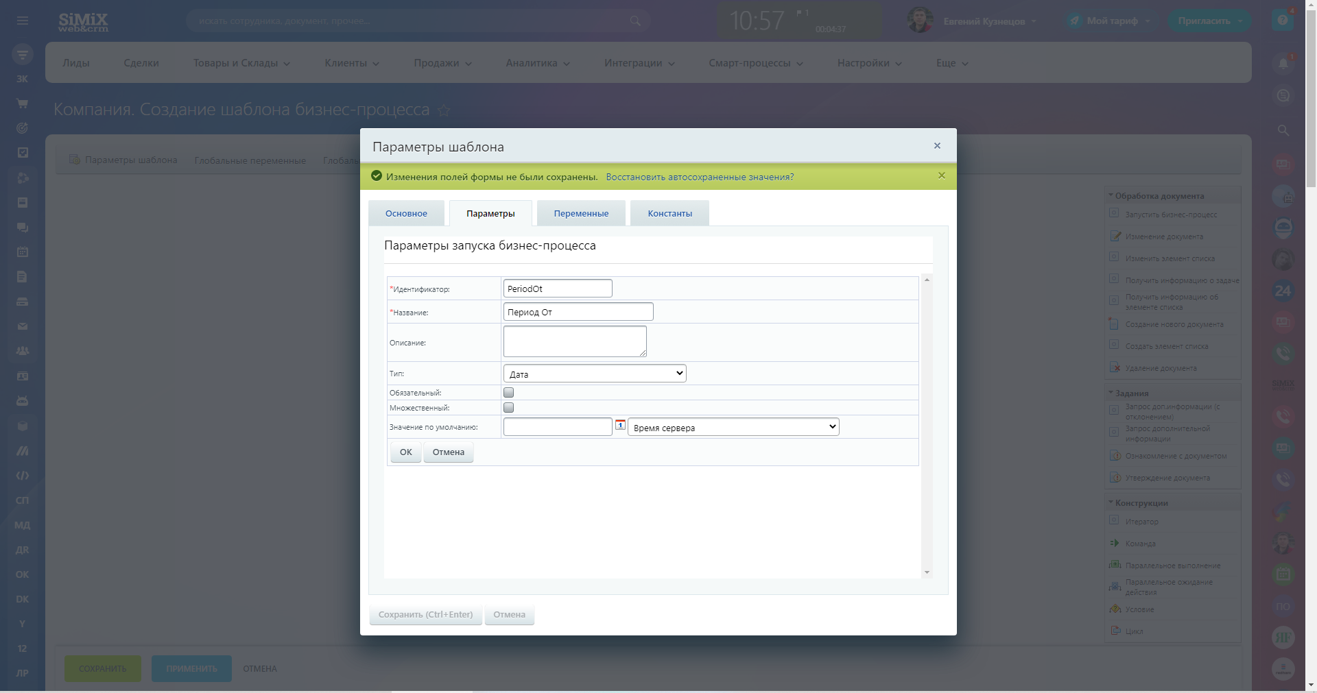3. Теперь добавьте через Параметры шаблоны 2 параметра запуска бизнес-процесса, мы задаем период за который нужно будет собирать отчет.