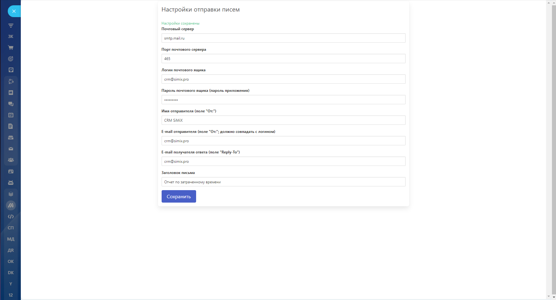 6. Параметр Email для отправки отчета заполняется если вы выполнили настройки smtp из пункта 1. На этот адрес будет отправлен отчет. Сам адрес можно взять из значения поля Email сущности компания.