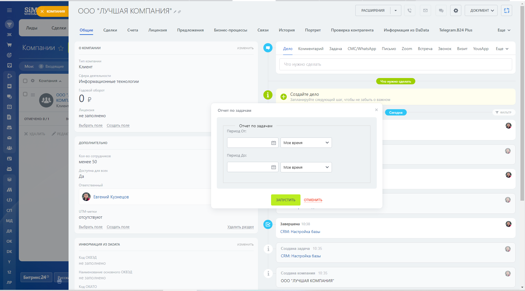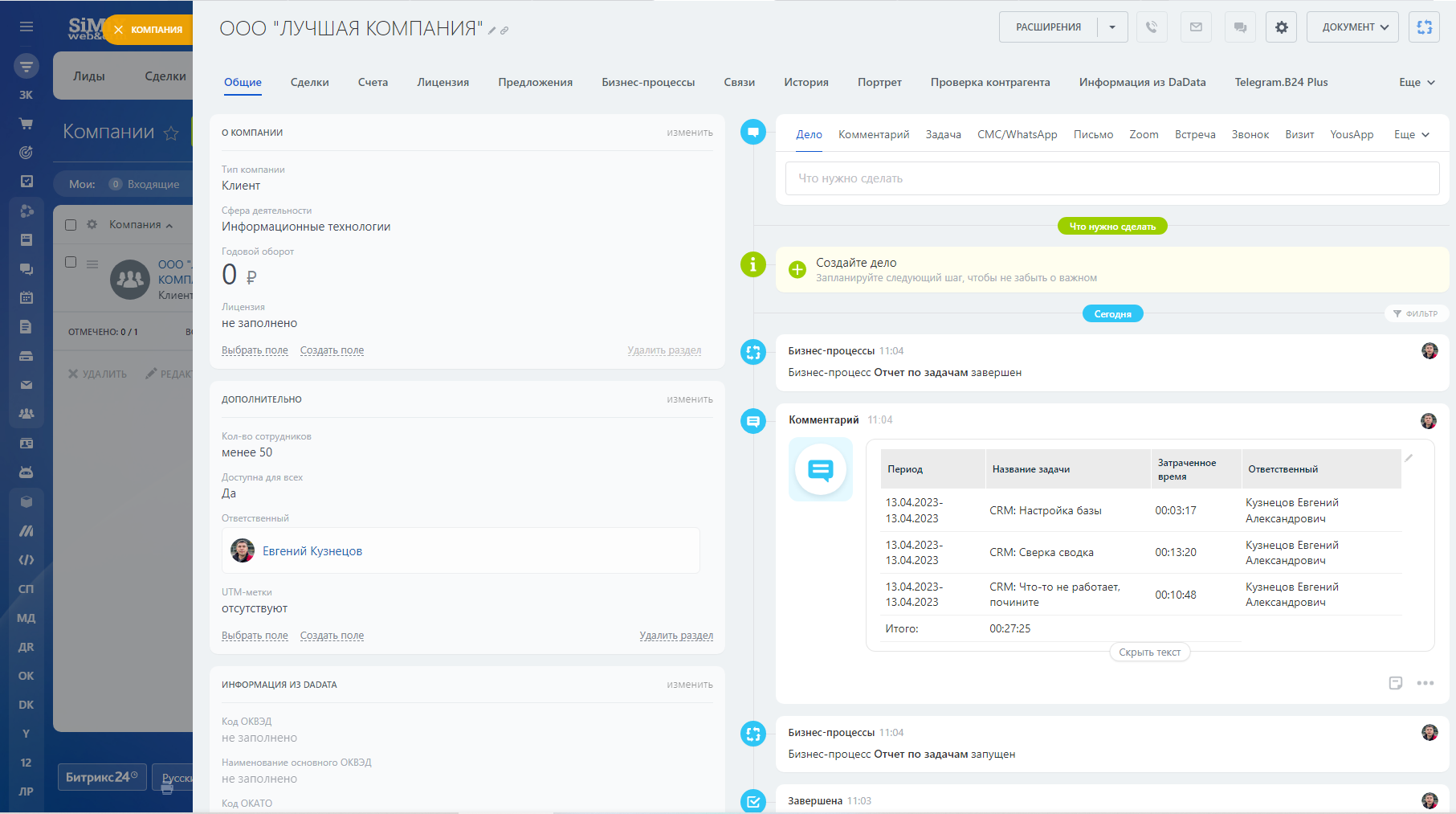 7. Самым простым, будет добавление комментария в таймлайн карточки компании (на основе этих данных можно выставить счет, например)