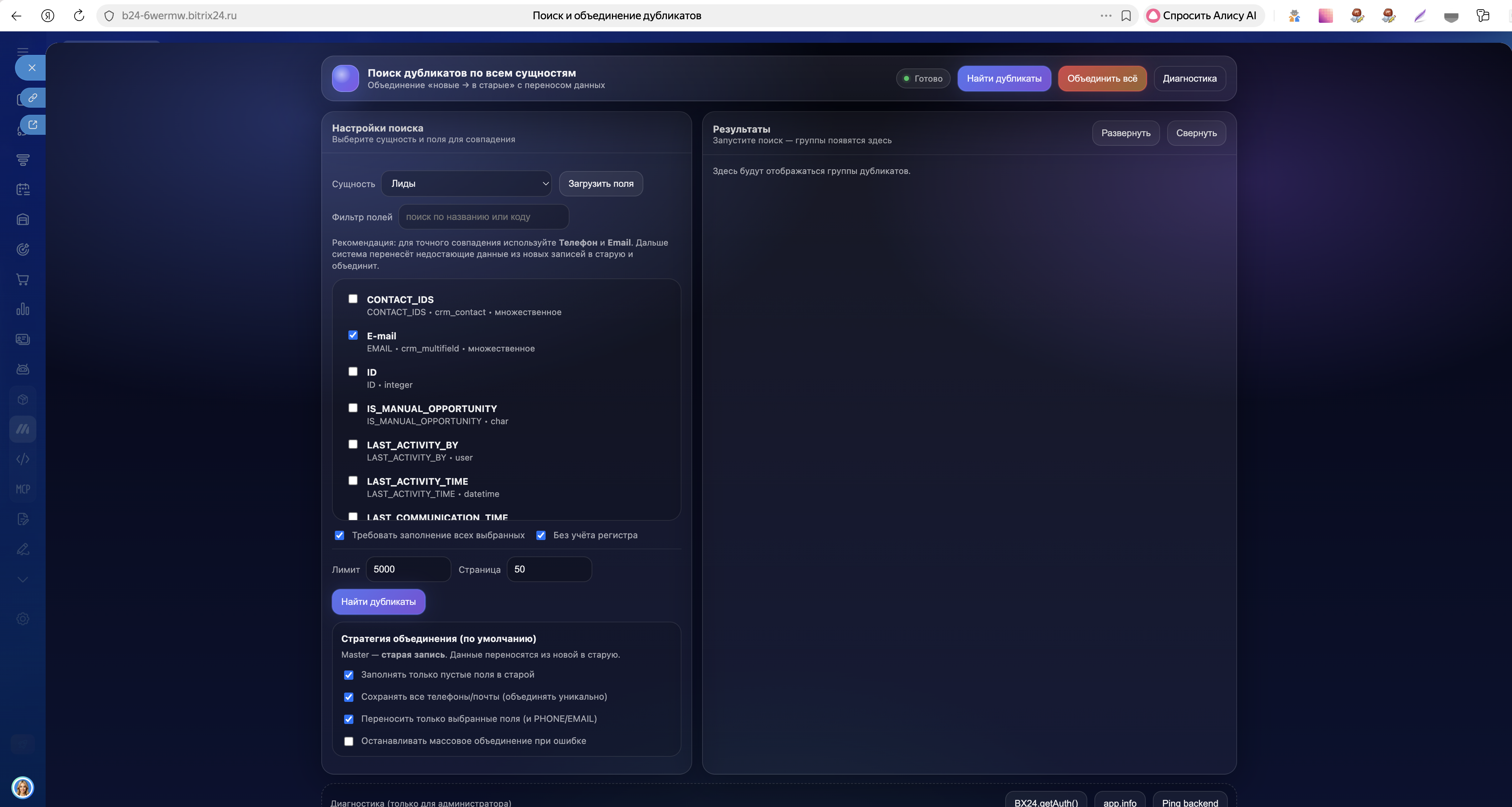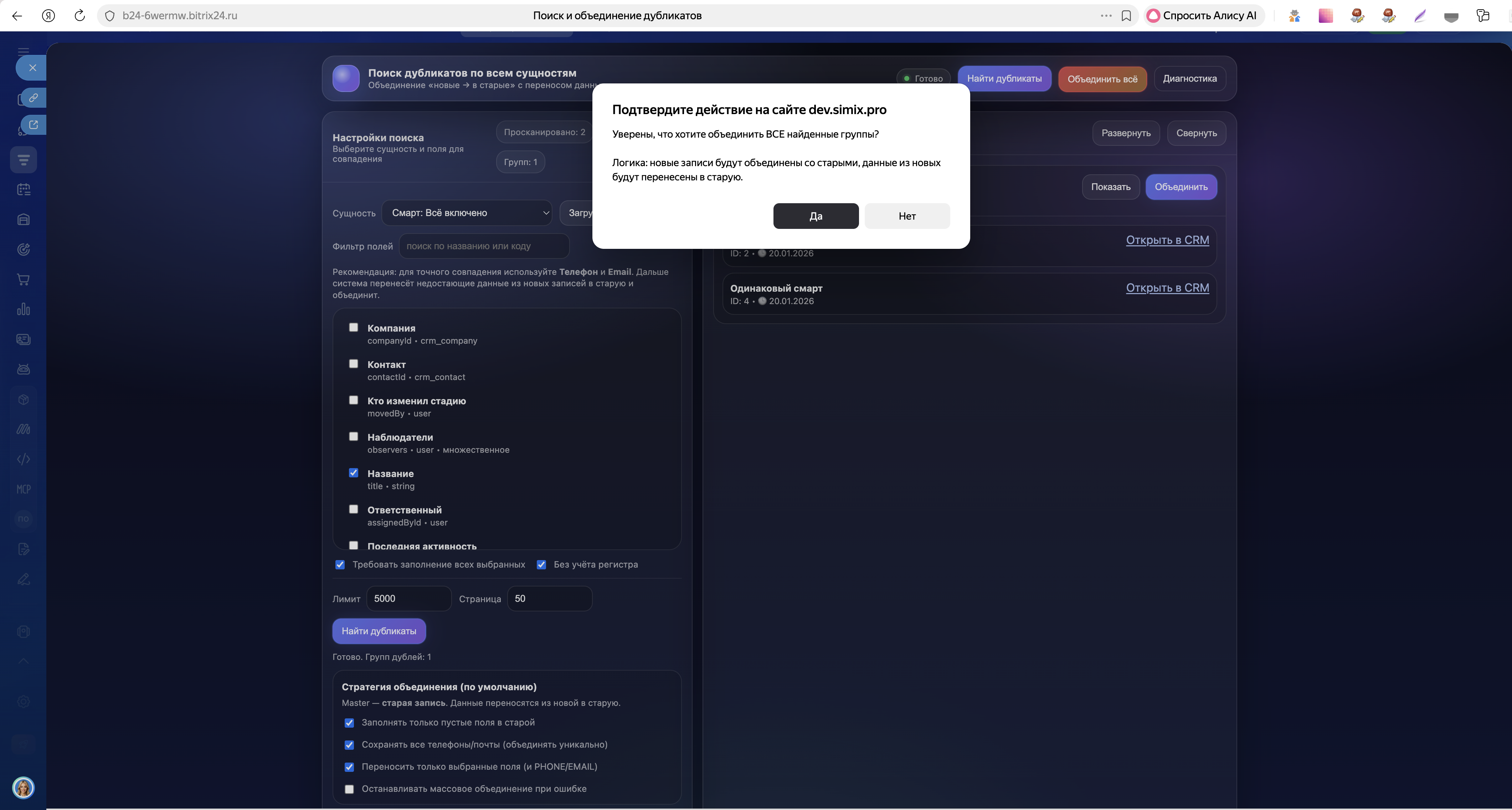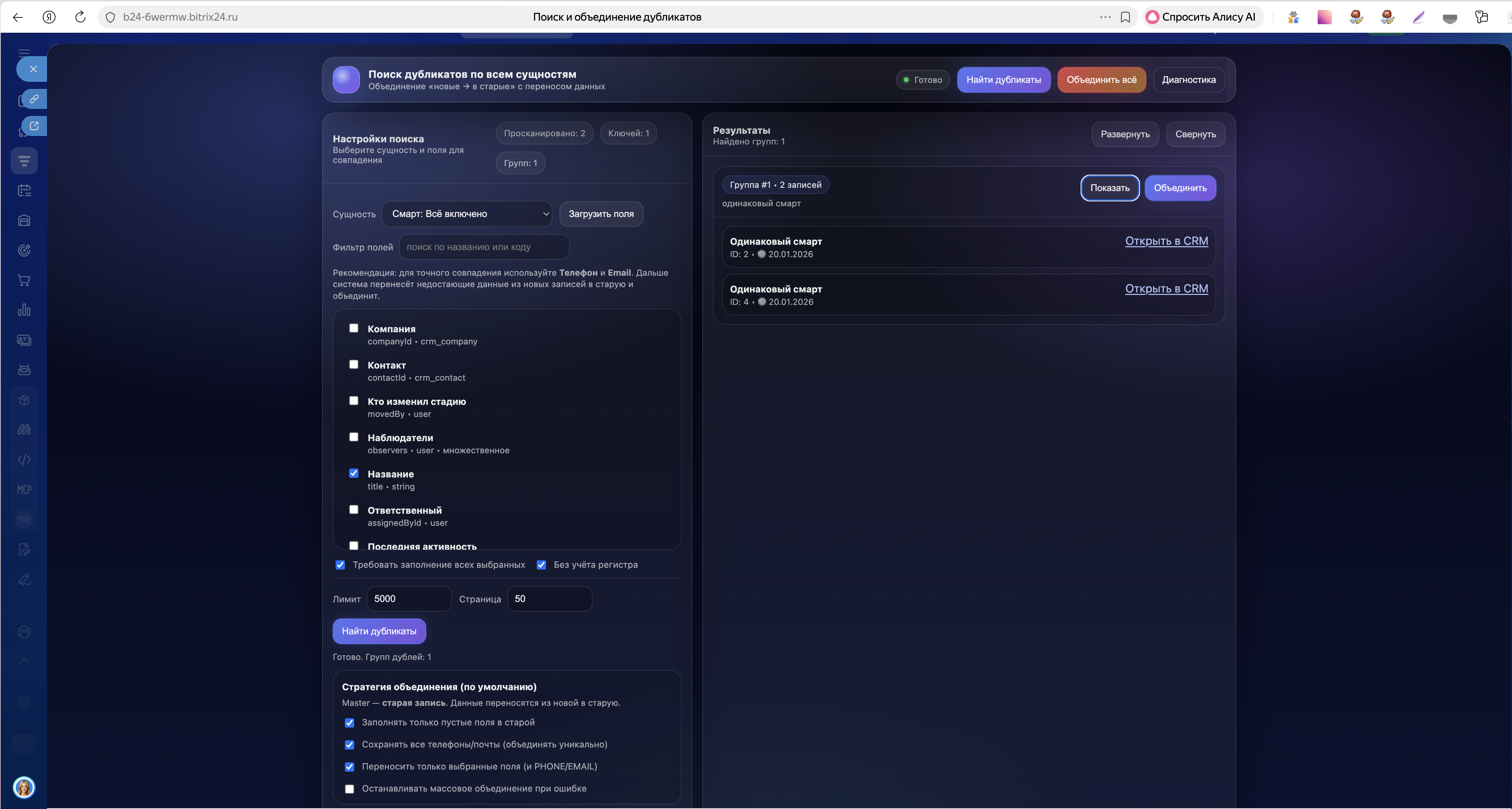 Приложение помогает быстро находить и безопасно объединять дубликаты во всех CRM-сущностях: Лиды, Сделки, Контакты, Компании, Смарт-процессы. Вы сами выбираете поля сравнения (включая пользовательские), получаете группы совпадений и объединяете записи в удобном интерфейсе.