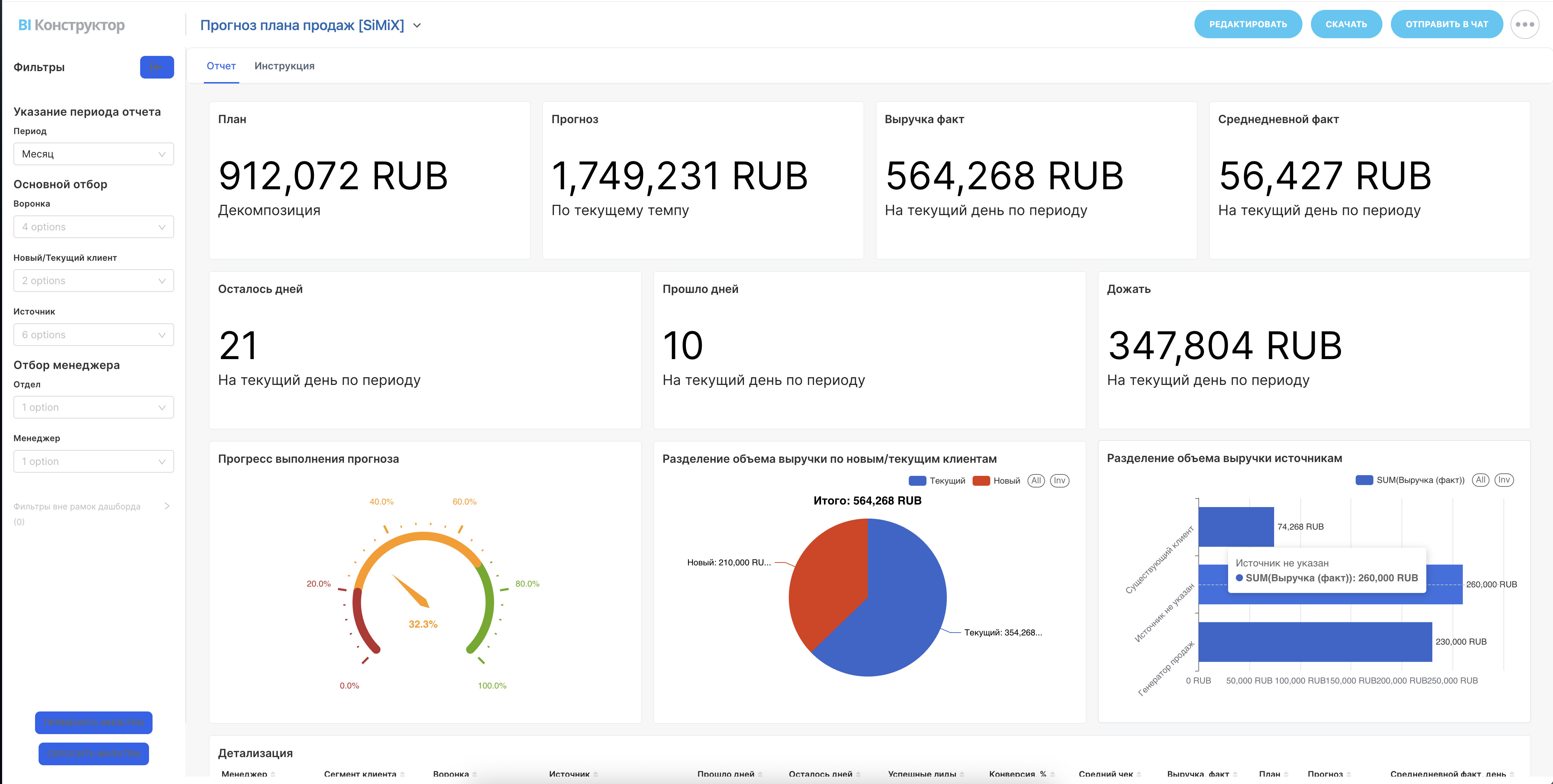 Отчёт показывает выполнение плана продаж на выбранный период с двух сторон: