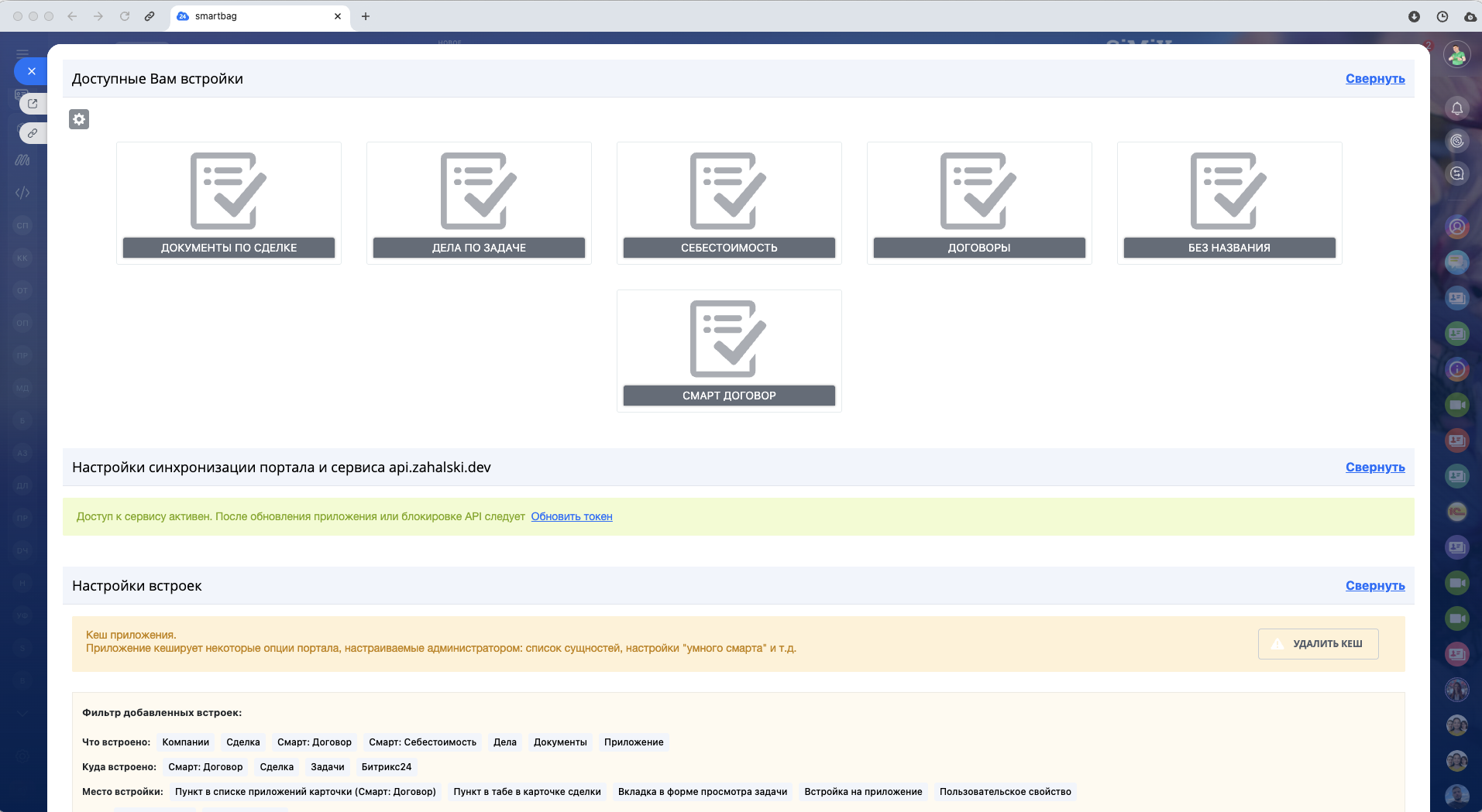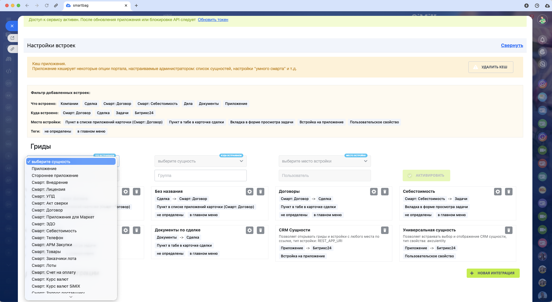 Возможные места встройки (доступны в зависимости от сущности):- Вкладки в карточке CRM сущностей (лиды, контакты, компании, сделки, смарт процессы);
