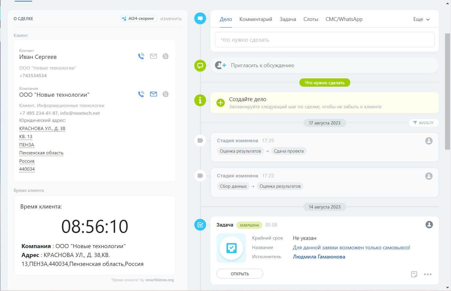 Приложение Время у клиента в CRM показывает текущее время вашего клиента: контакта или компании, учитывая их часовой пояс.