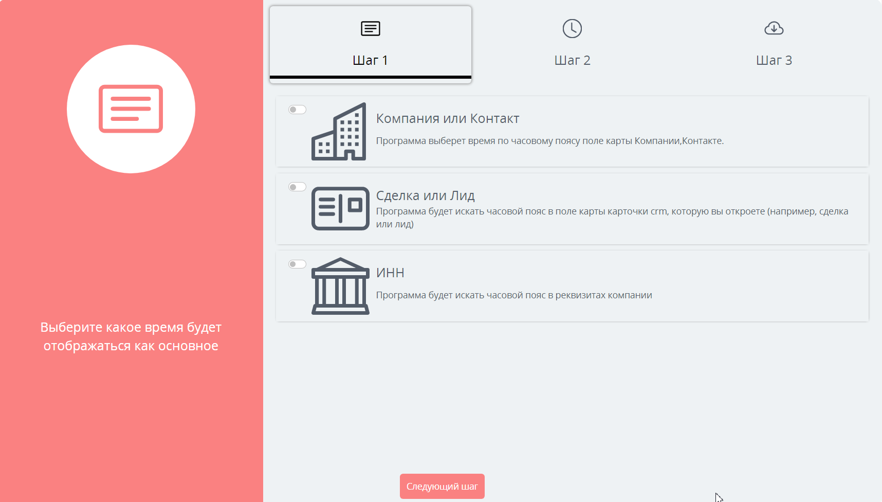 В предыдущей версии программа определяла время клиента по часовому поясу поля Карты из карточек CRM: Компании, Контакты, Сделки, Лиды.
