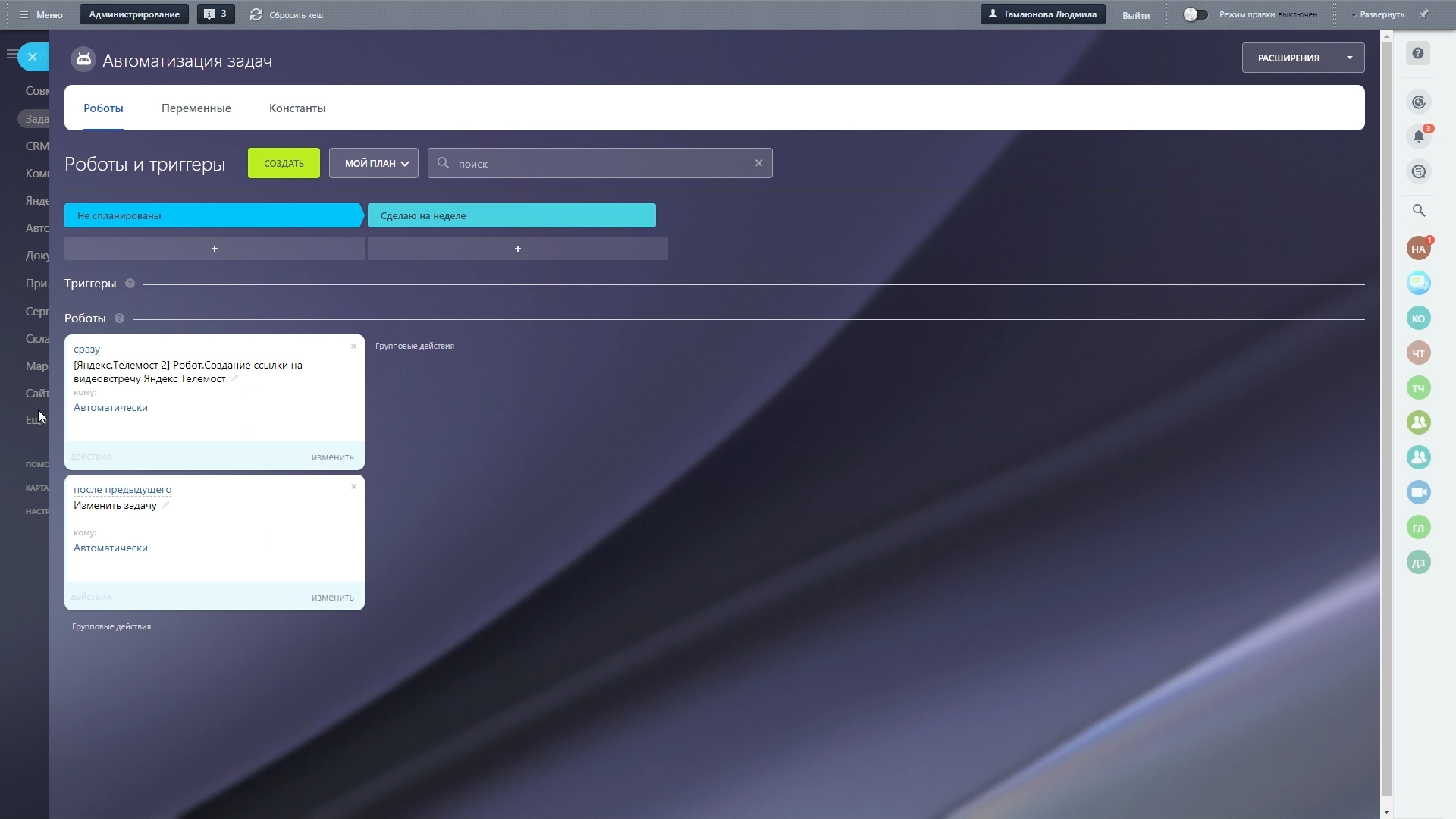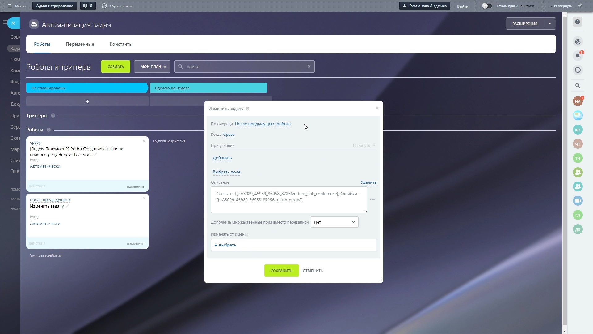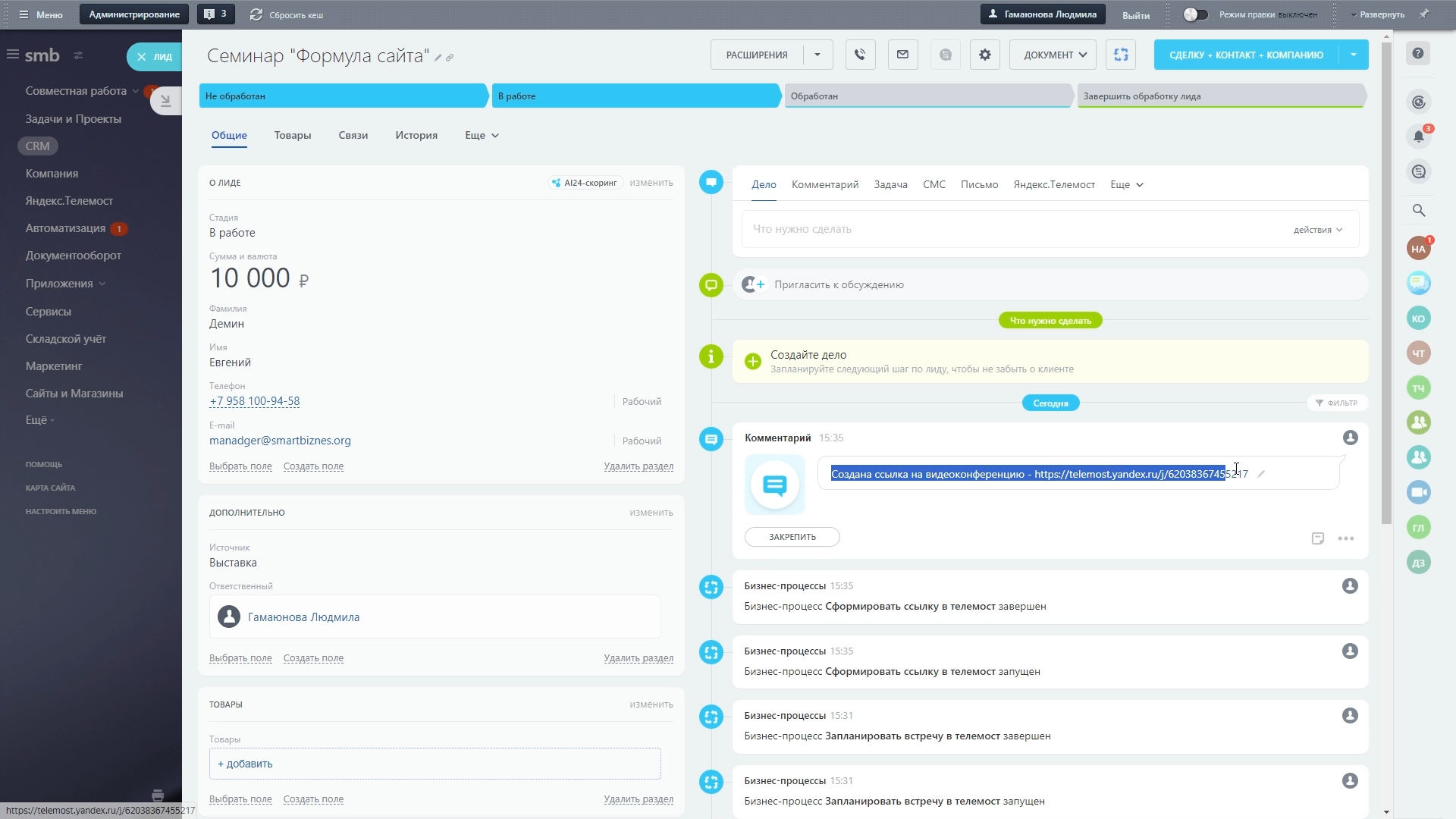 Так же мы добавили создание ссылок на конференции Яндекс.Телемост через раздел Автоматизация. Это позволяет добавить ссылки в задачи, в описание карточек и дополнительные поля.