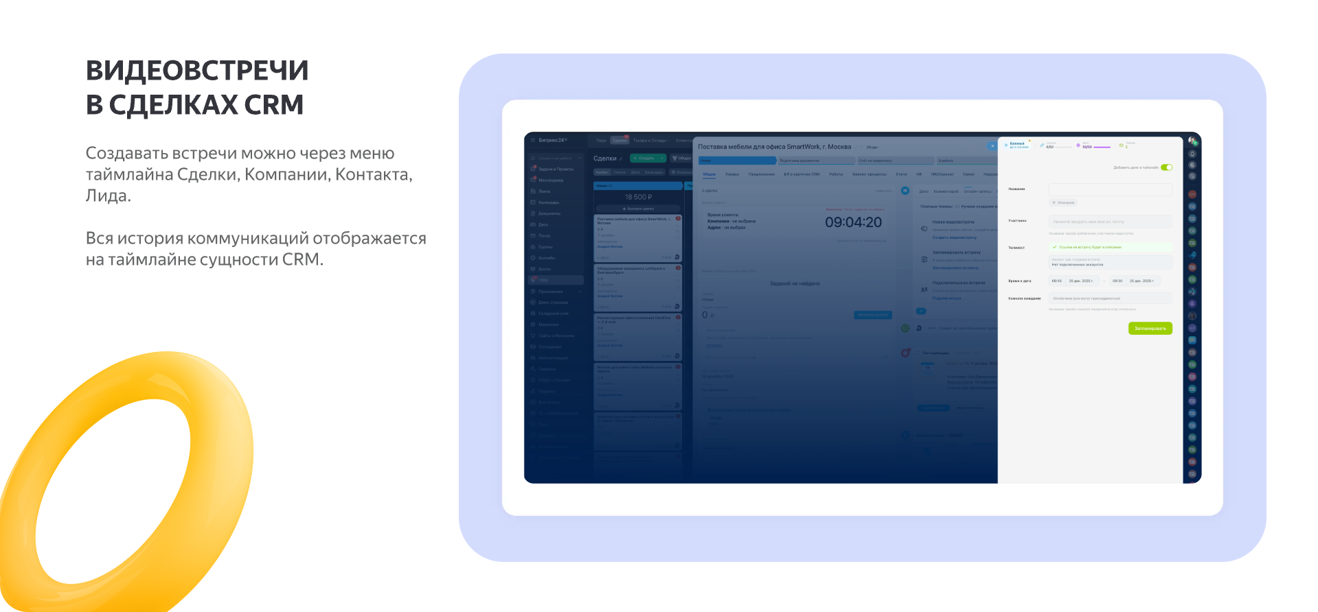 Создавайте встречи в один клик — из карточки клиента, задачи, смарт-процесса или переписки в чатах. Ссылка генерируется мгновенно и отправляется участникам.