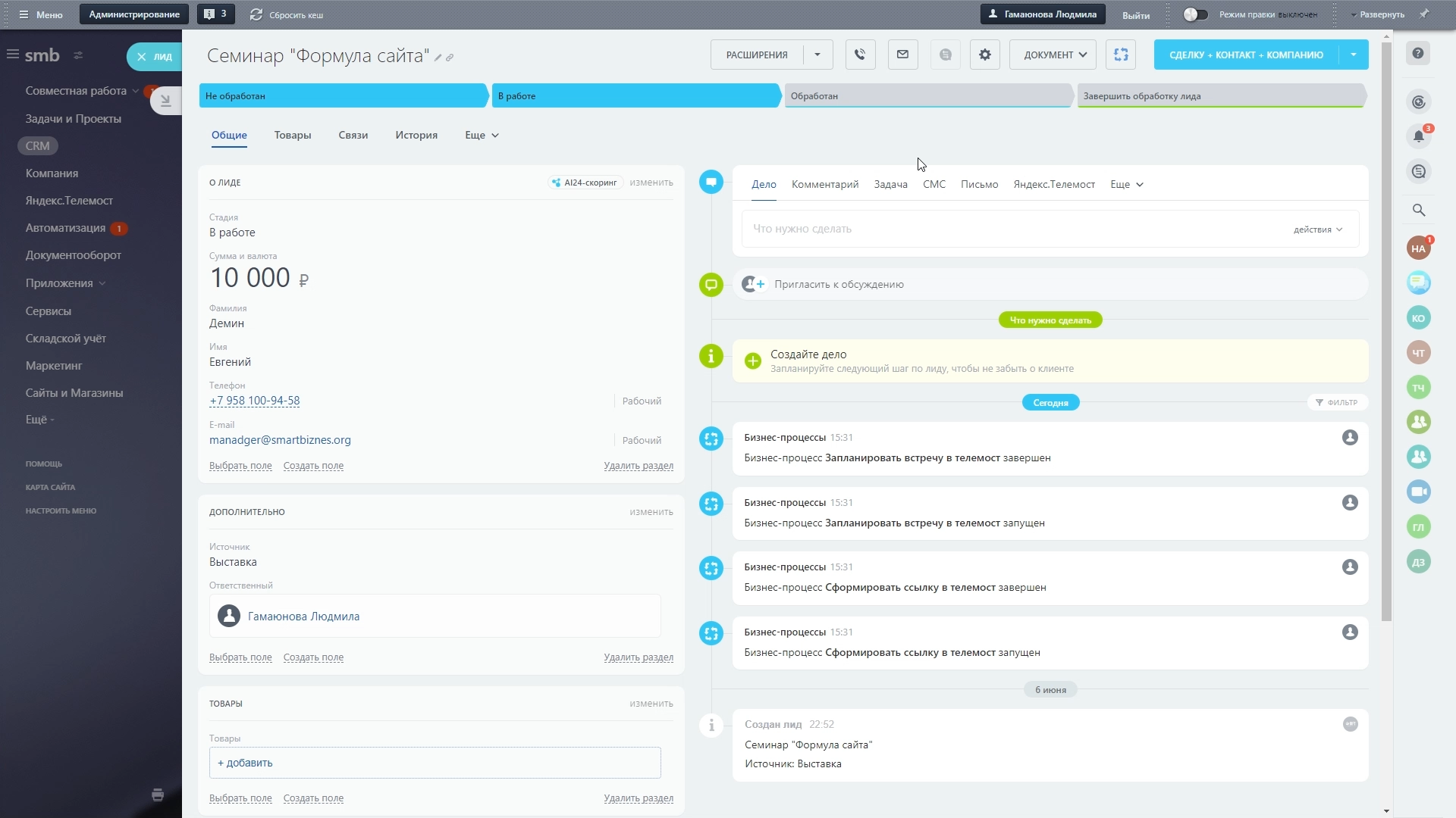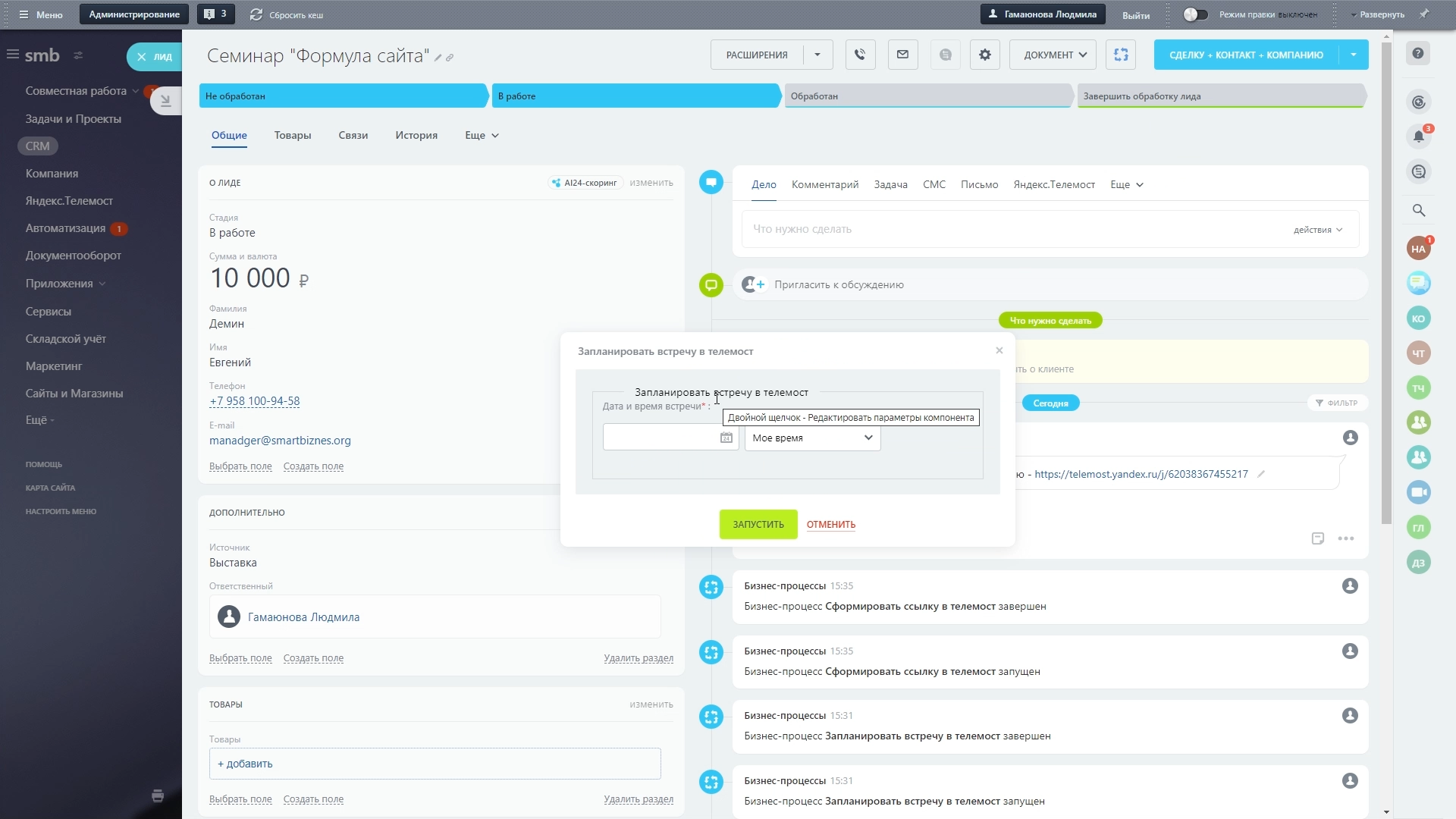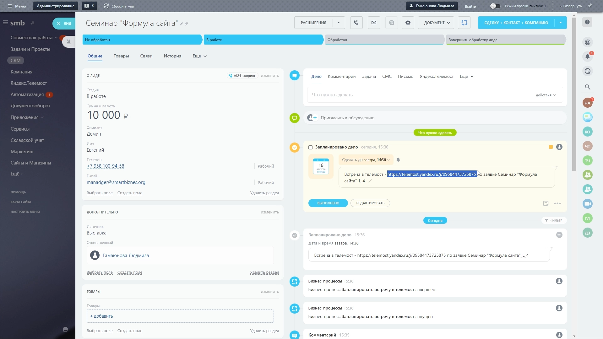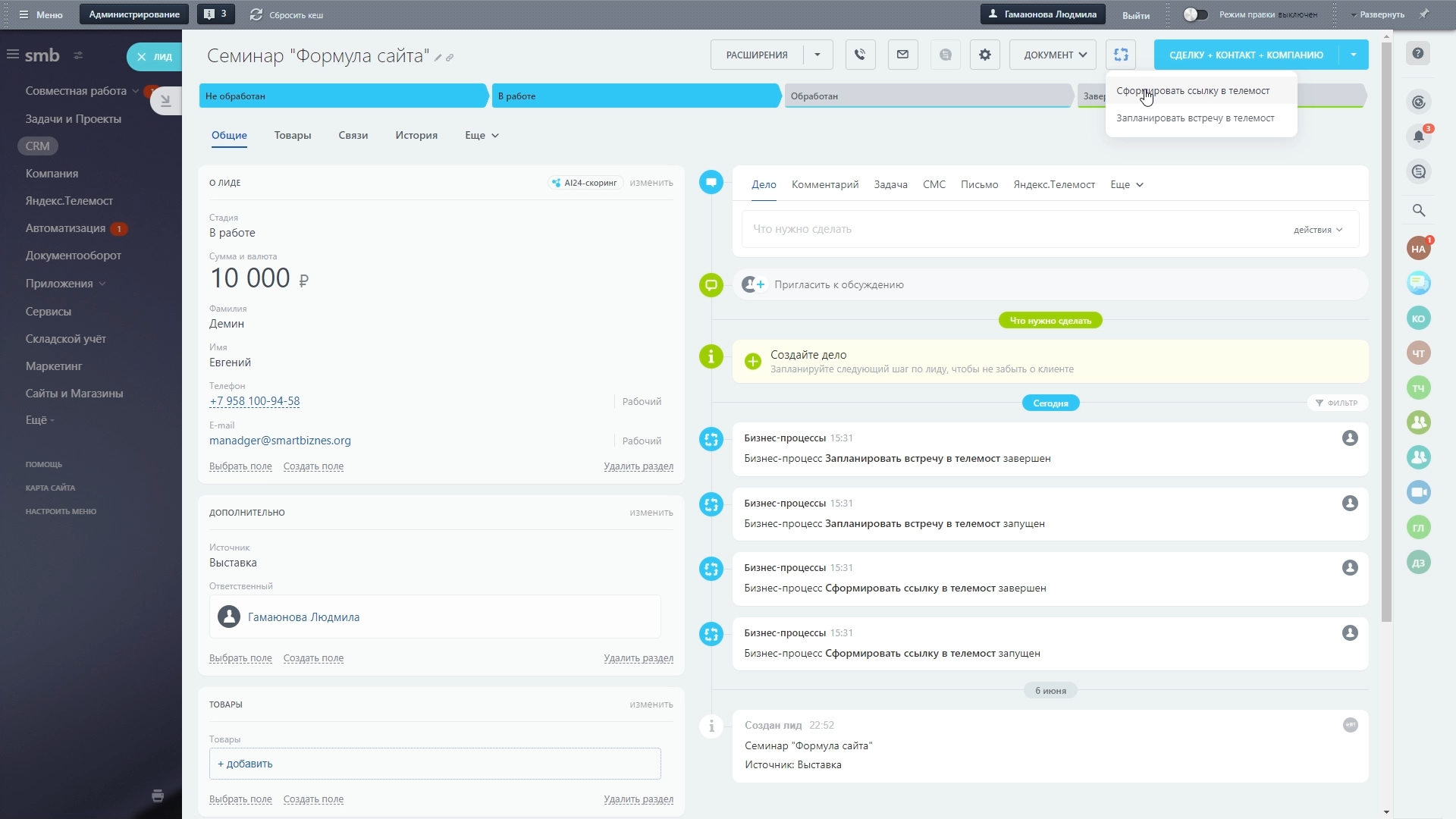 Приложение Telemost позволяет создавать и планировать онлайн-встречи и конференции прямо из карточки сделки CRM, в Задачах, в разделе Автоматизация Битрикс24. Назначать и планировать видеовстречи можно из кнопки Процессы, история отображаются на таймлайне в сделке.