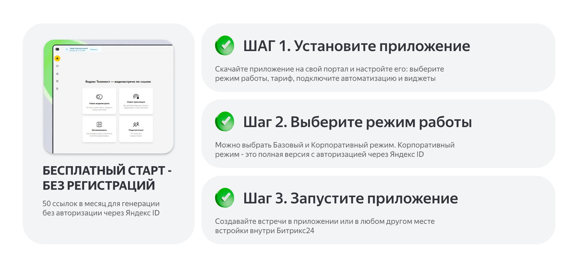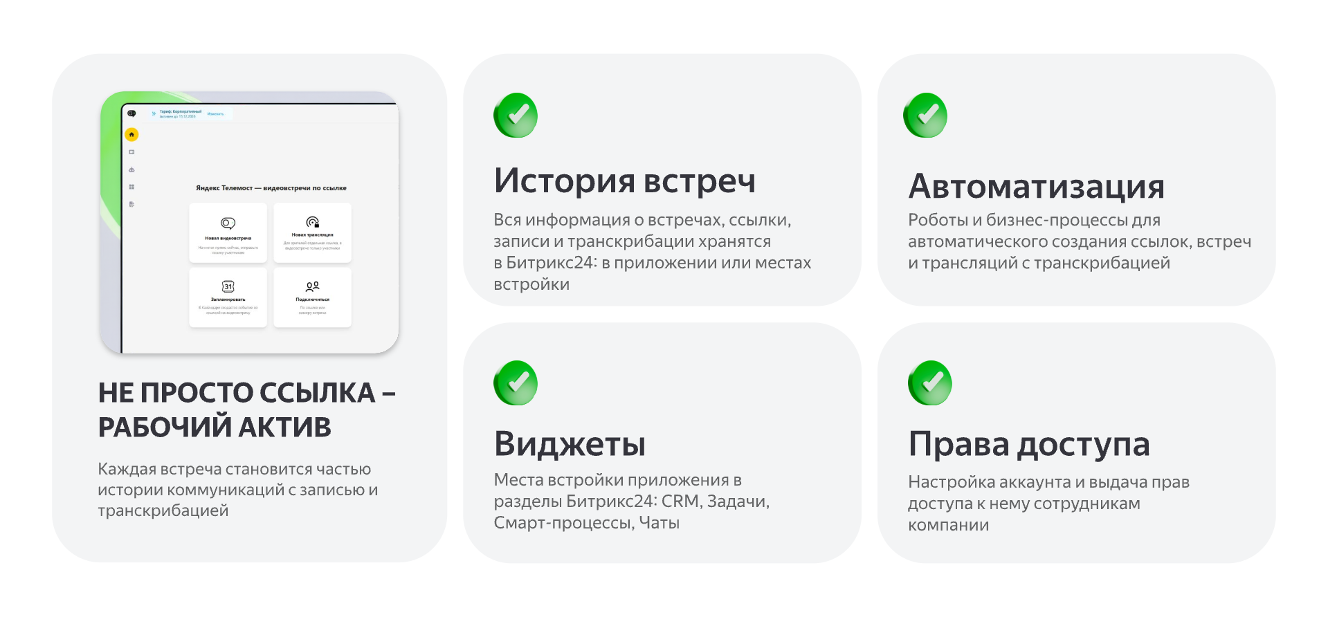 Приложение Яндекс Телемост превращает видеоконференцию в полноценный бизнес-процесс: с историей, контекстом, автоматизацией и безопасным хранением данных внутри Битрикс24.