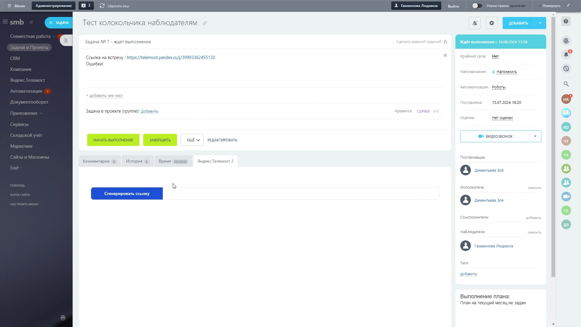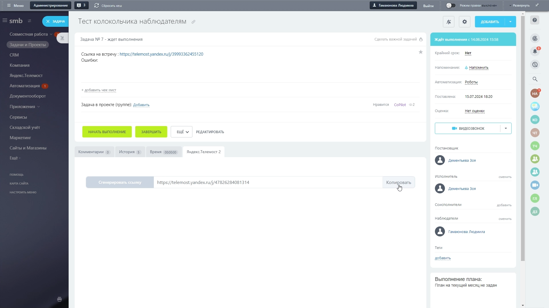 Еще мы добавили возможность формировать ссылку на встречу в Задачах Битрикс24, в отдельном разделе Яндекс.Телемост.
