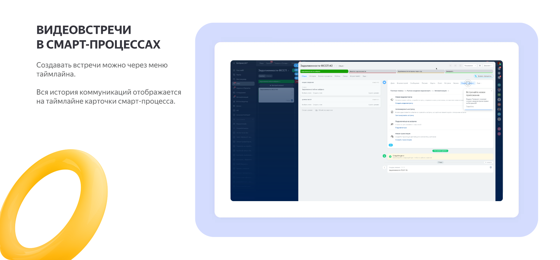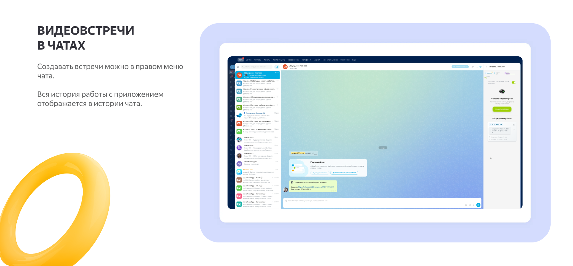 Интеграция Yandex Telemost позволяет создавать, планировать и хранить видеоконференции в контексте CRM, задач, чатов и смарт-процессов. Больше не нужно переключаться между сервисами: всё в одном рабочем пространстве.