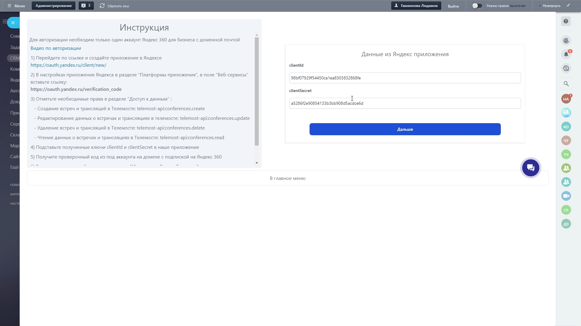 ШАГ 5. После того, как полученные ключи вставили в наше приложение, введите проверочный код в приложение "Интеграция Яндекс.Телемост"