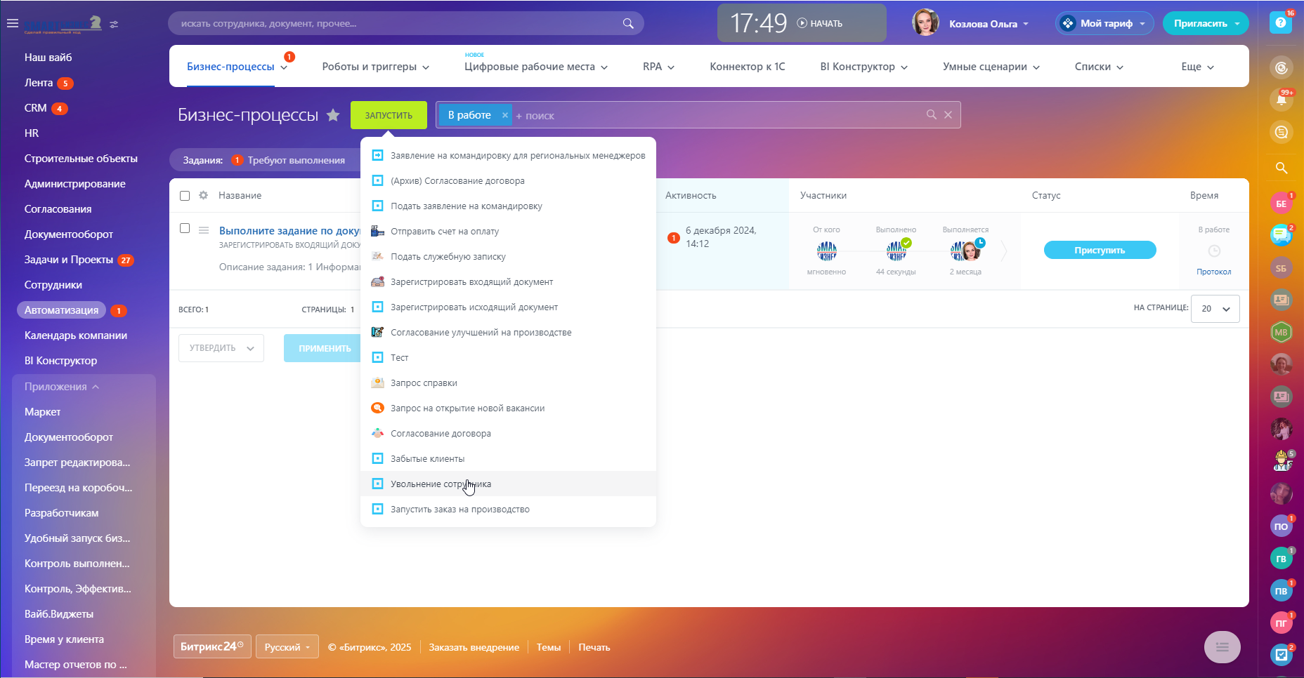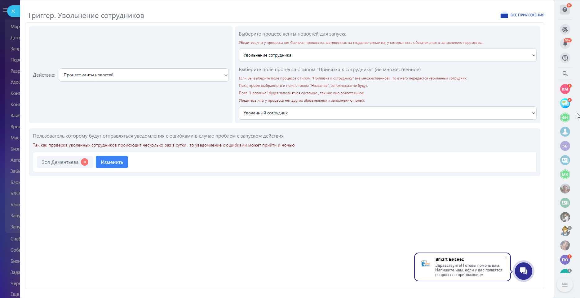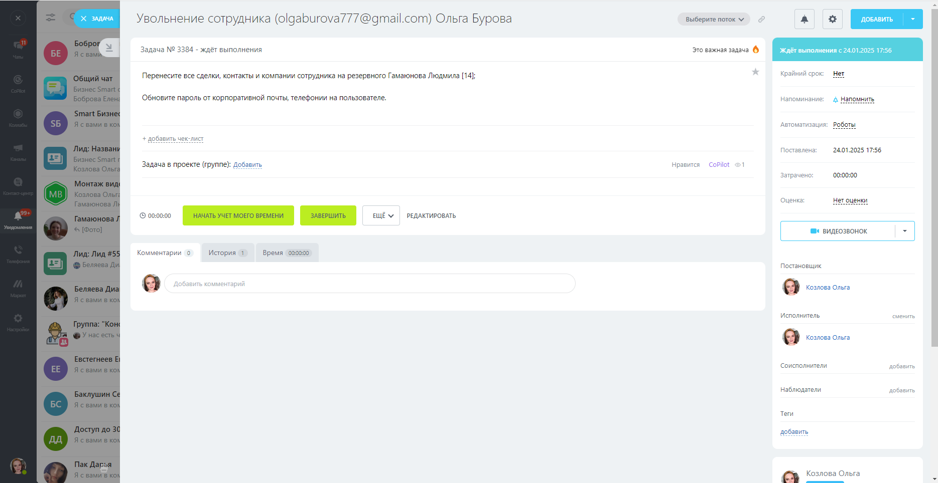 Вы сможете настроить процесс на автоматическую постановку задачи на IT-отдел по ограничению прав доступа или передачу компаний/сделок новому сотруднику.