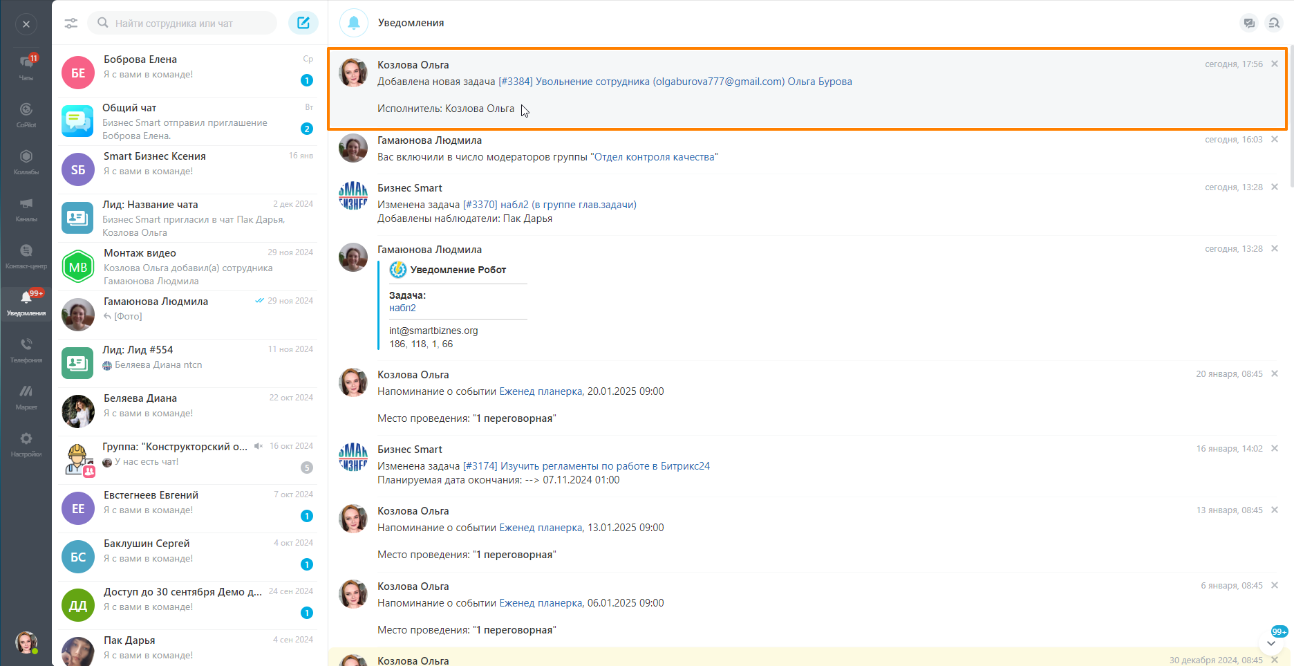 Приложение Событие на удаление пользователя позволяет запустить процесс или вебхук по событию увольнения сотрудника с портала. Можно настроить процесс с автоматической постановкой задачи на IT-отдел и РОПа, чтобы ограничить права доступа или передачу компаний/сделок новому сотруднику.