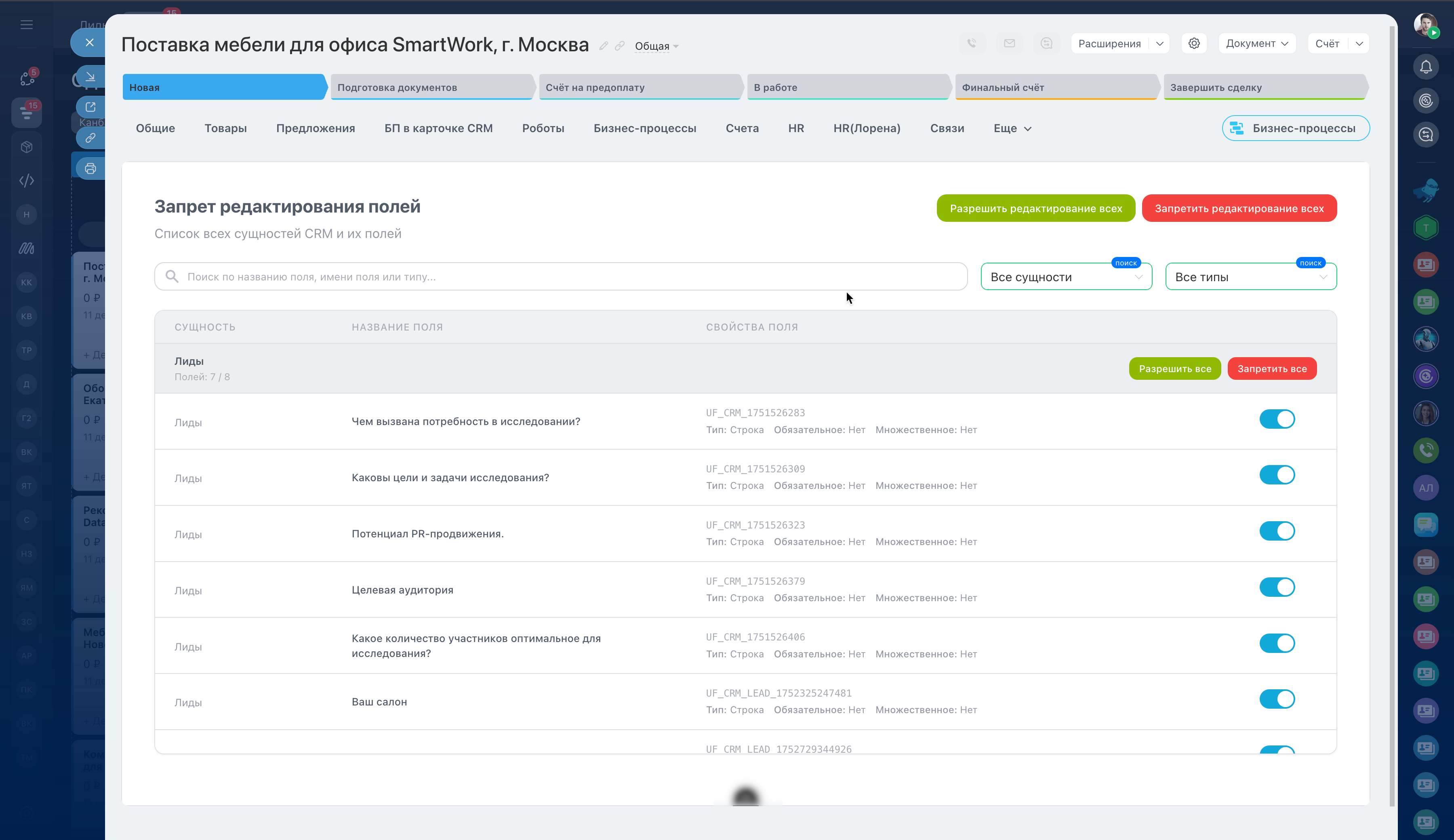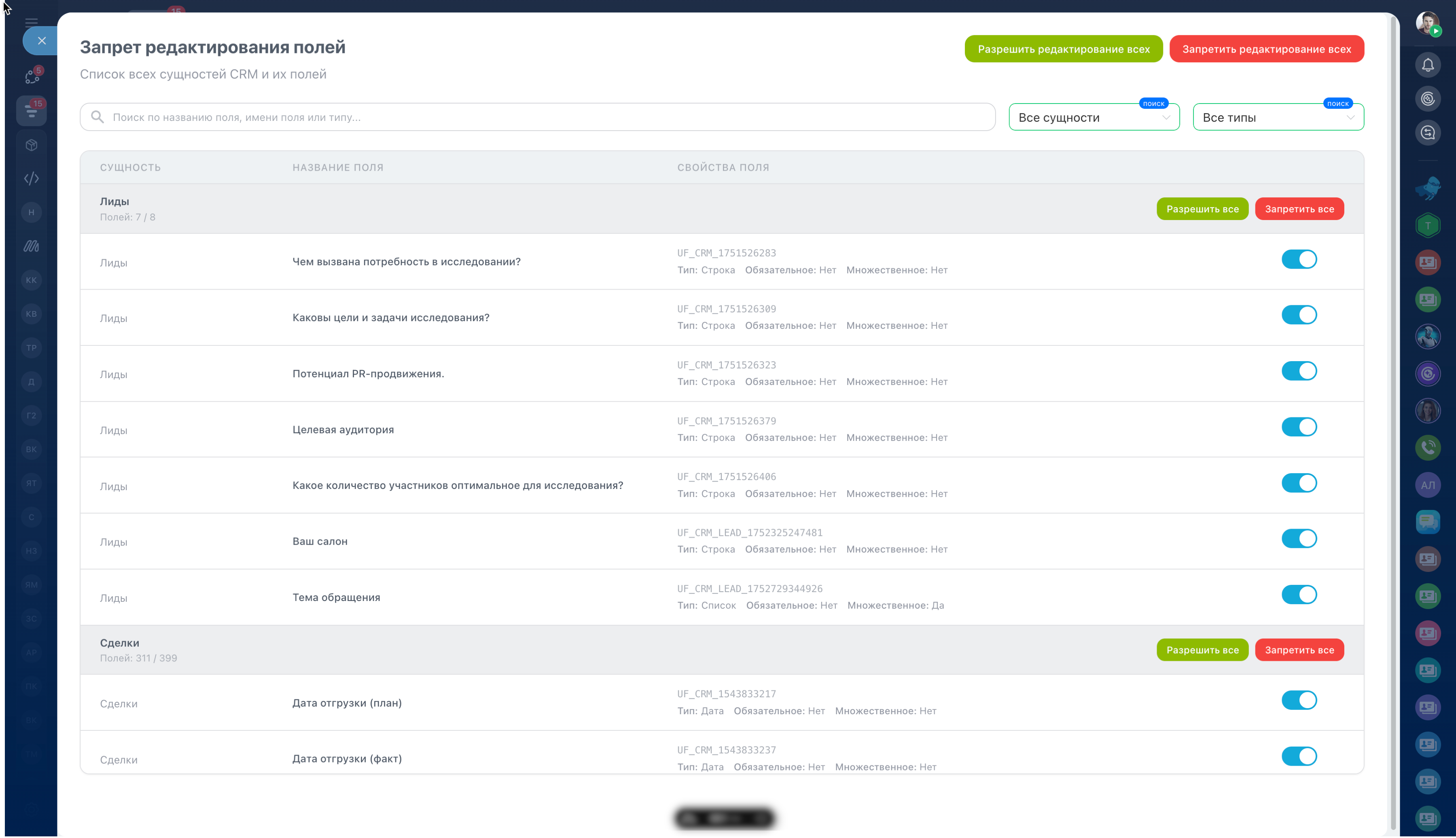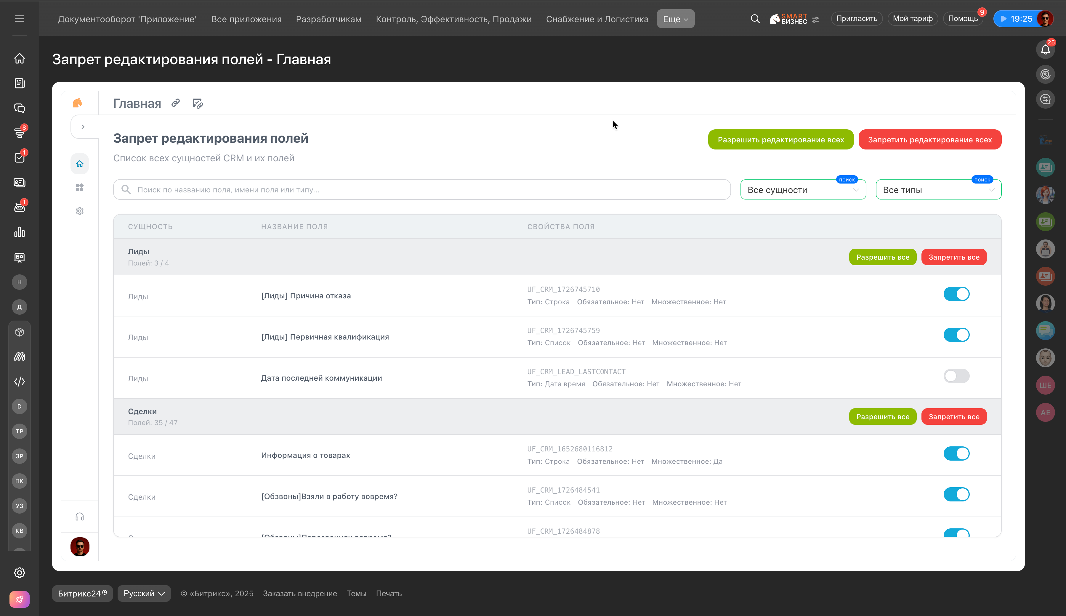 Приложение запрещает сотрудникам редактирование выбранных пользовательских полей в CRM: сделки, лиды, контакты, компании.