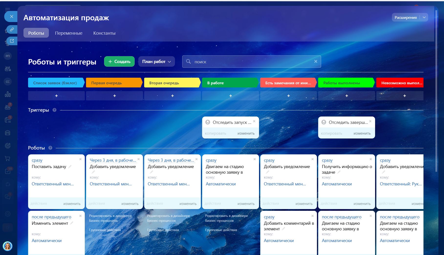 Бэклог → Первая очередь → Вторая очередь → В работе → Есть замечания → Работы выполнены → Успех