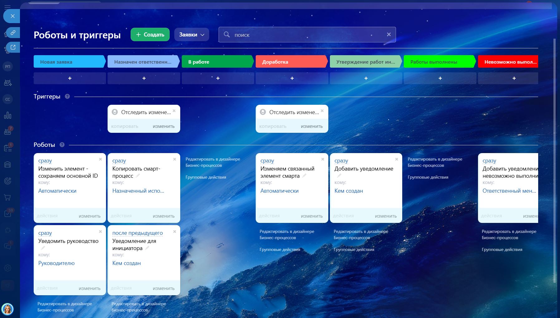 Всё автоматизировано. Статусы меняются сами, уведомления приходят автоматически, заявки не теряются.